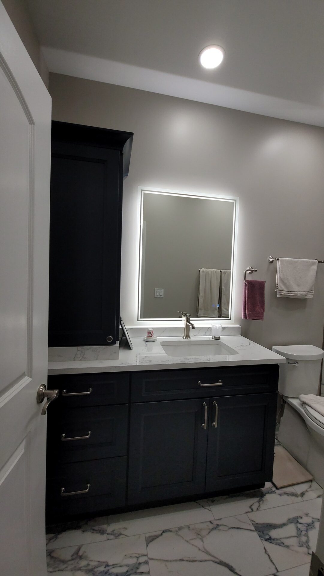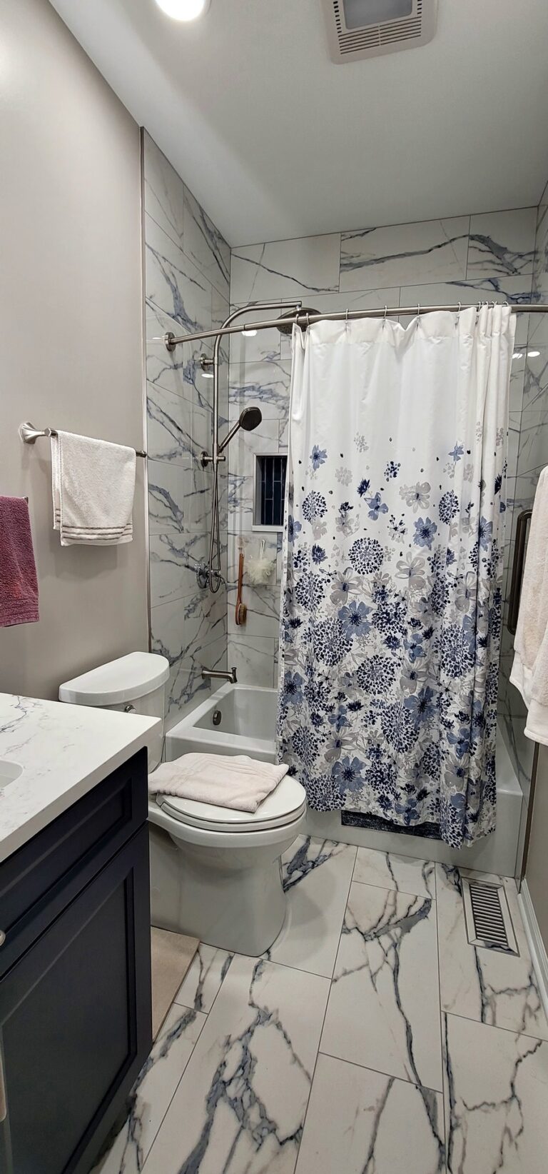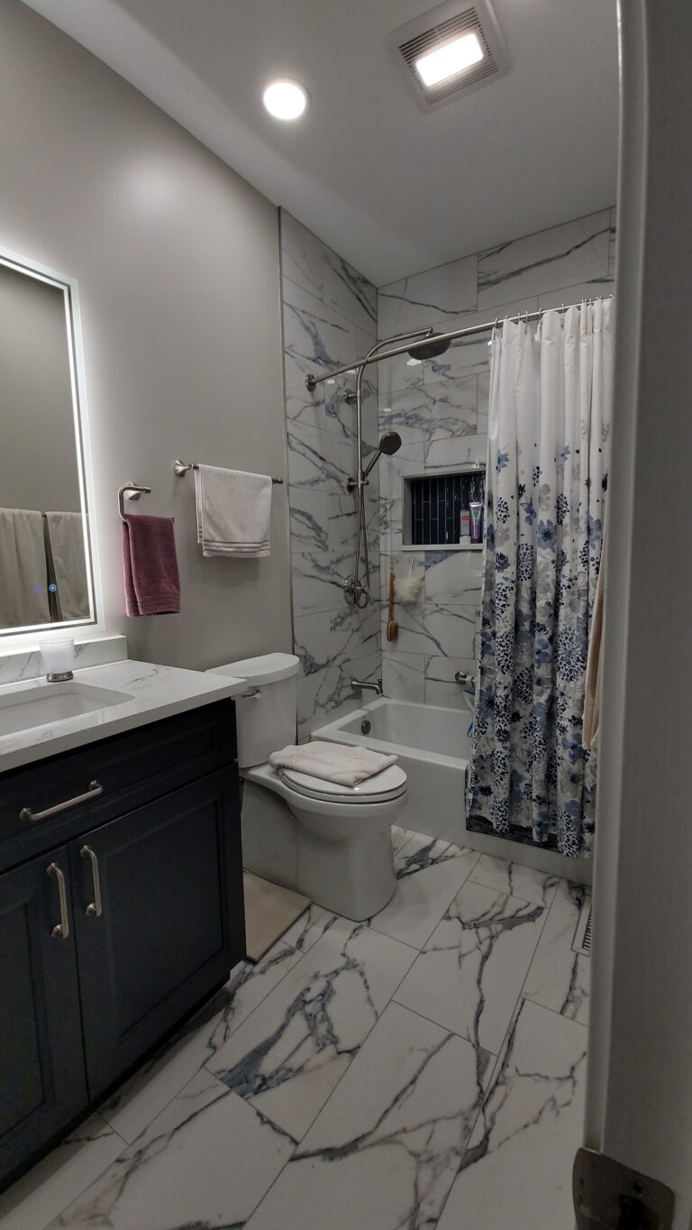 Sophisticated navy cabinetry meets stunning marble-look tile in this complete Hoffman Estates bathroom transformation. Custom vanity storage maximizes functionality while LED-lit mirrors create perfect ambiance. Premium finishes and expert installation deliver a bathroom that truly reflects your personal style. Meticulous attention to detail creates an elegant sanctuary for relaxation and rejuvenation.