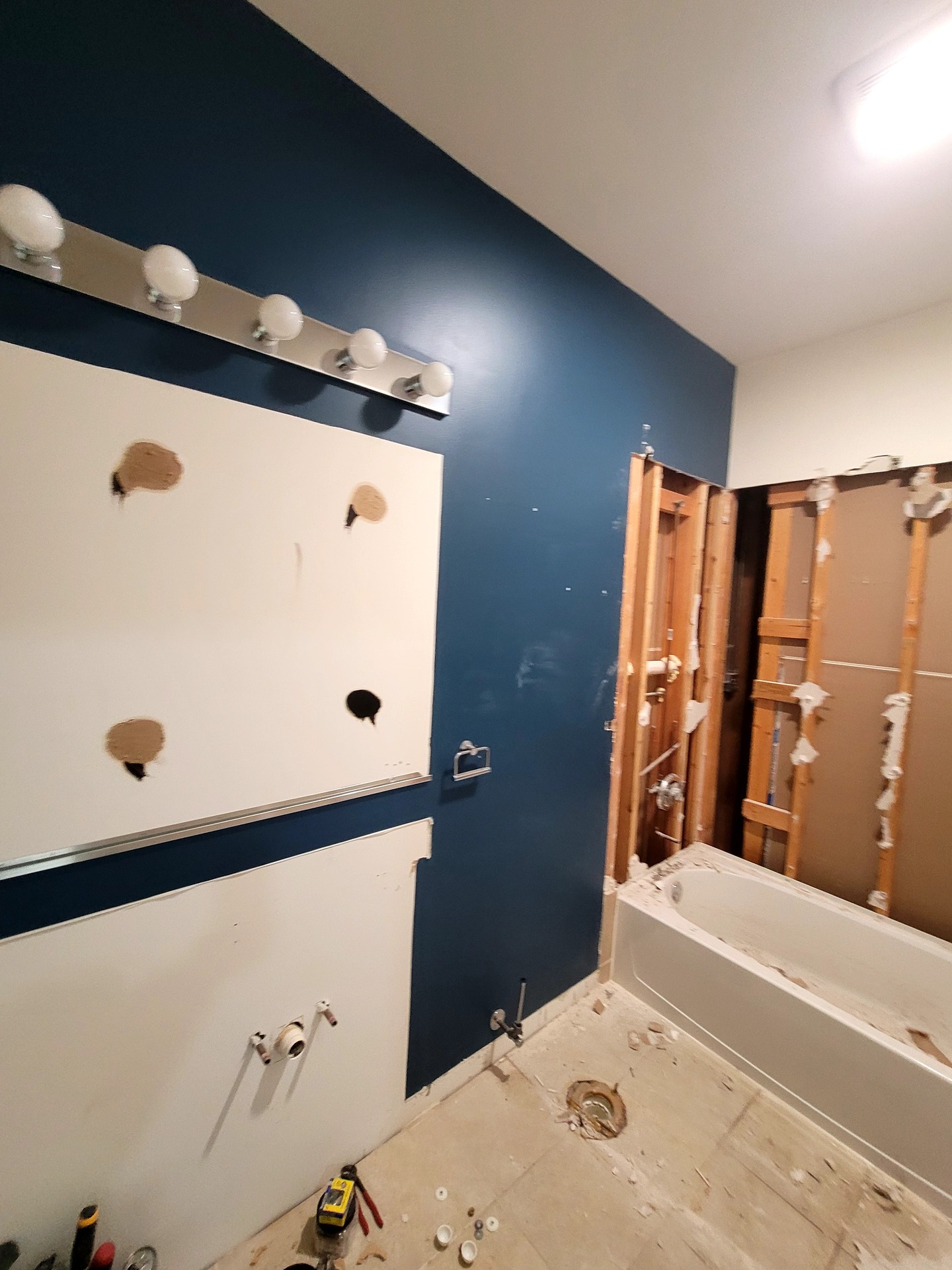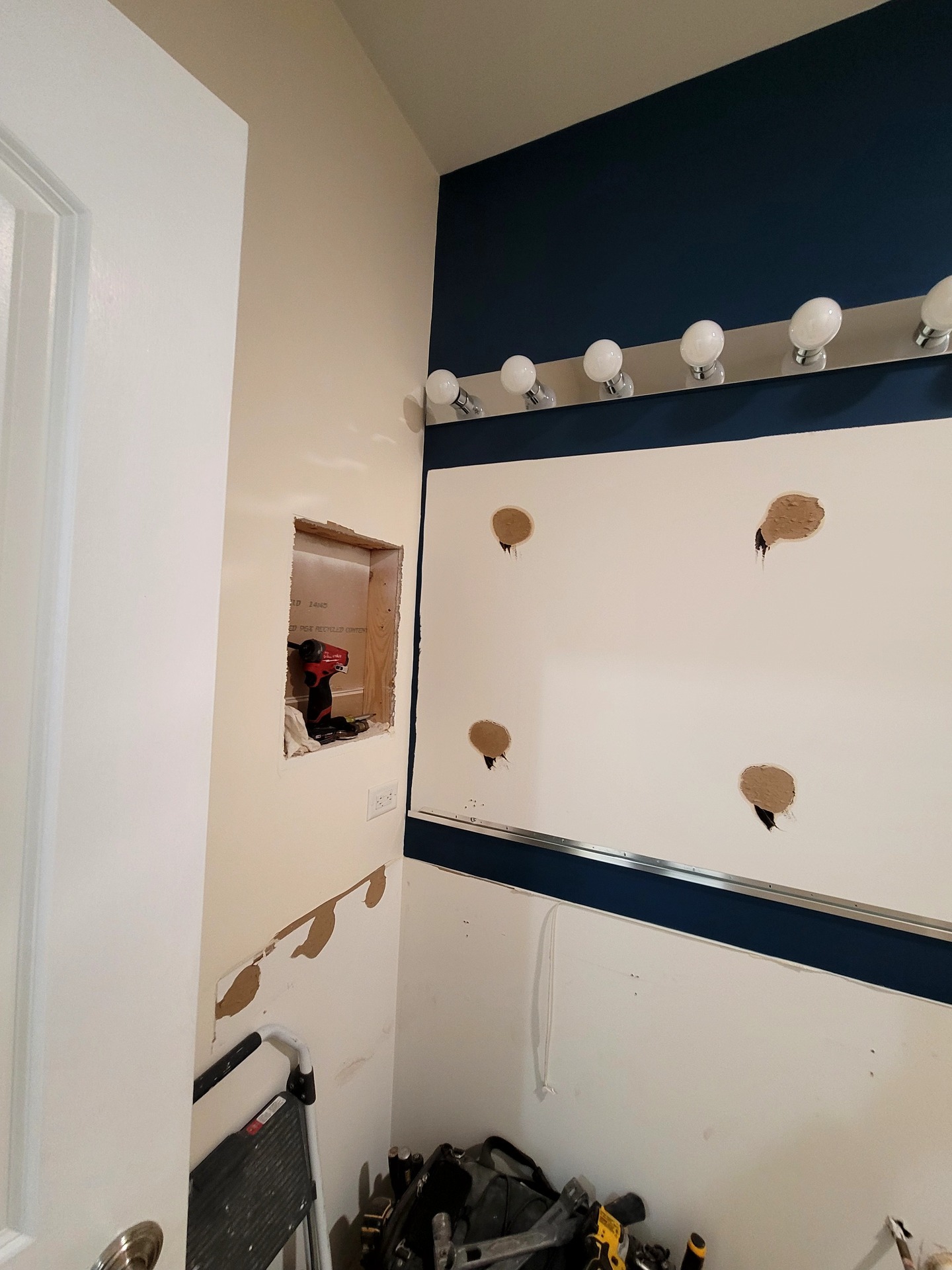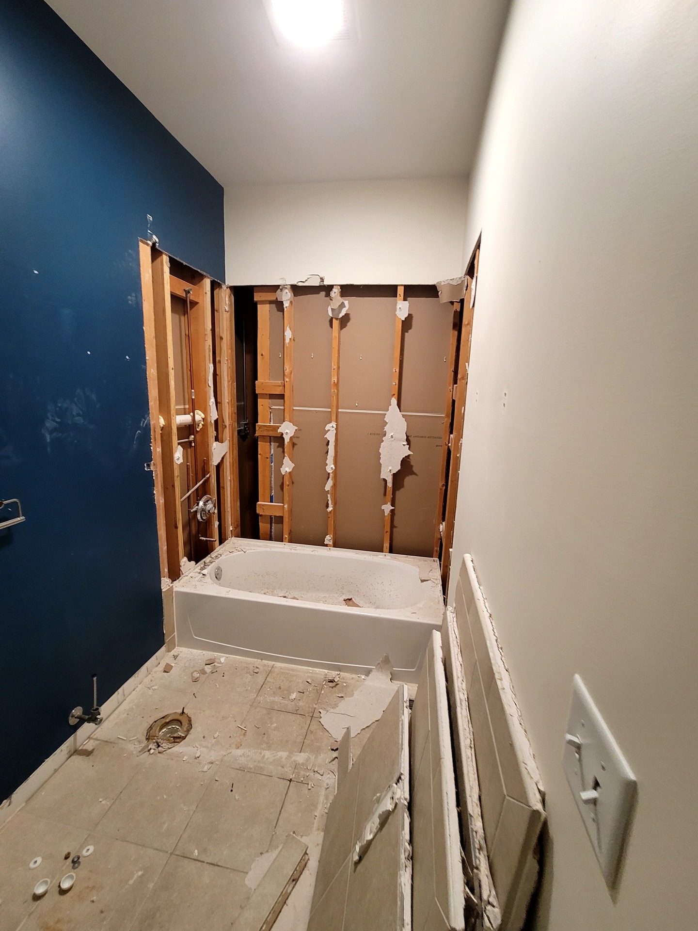 Sophisticated navy cabinetry meets stunning marble-look tile in this complete Hoffman Estates bathroom transformation. Custom vanity storage maximizes functionality while LED-lit mirrors create perfect ambiance. Premium finishes and expert installation deliver a bathroom that truly reflects your personal style. Meticulous attention to detail creates an elegant sanctuary for relaxation and rejuvenation.