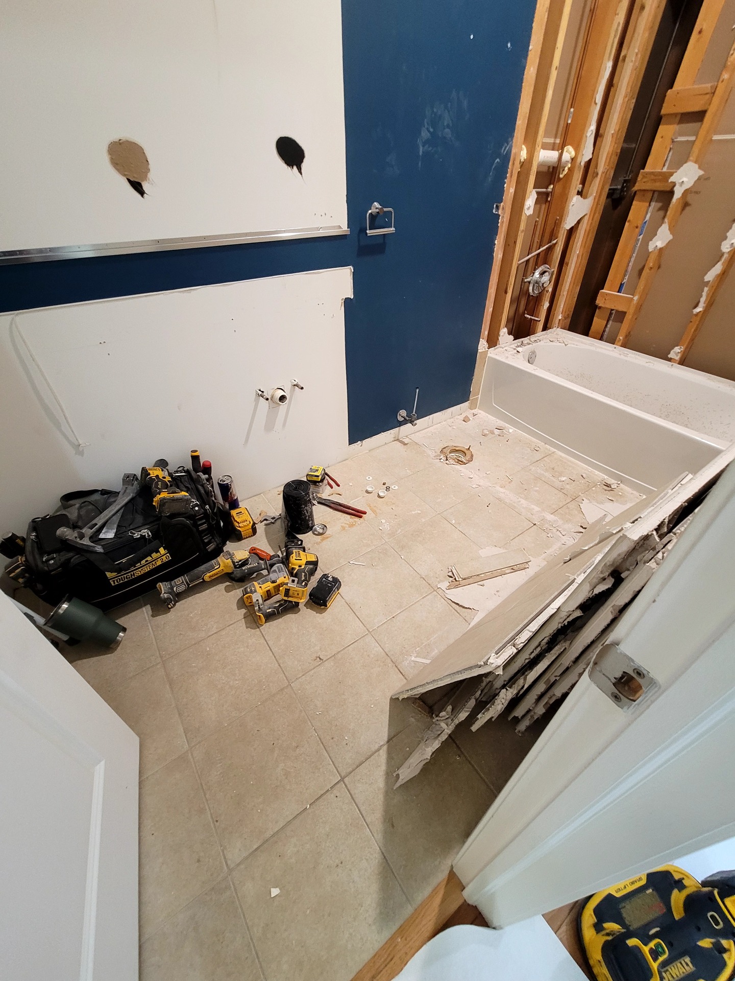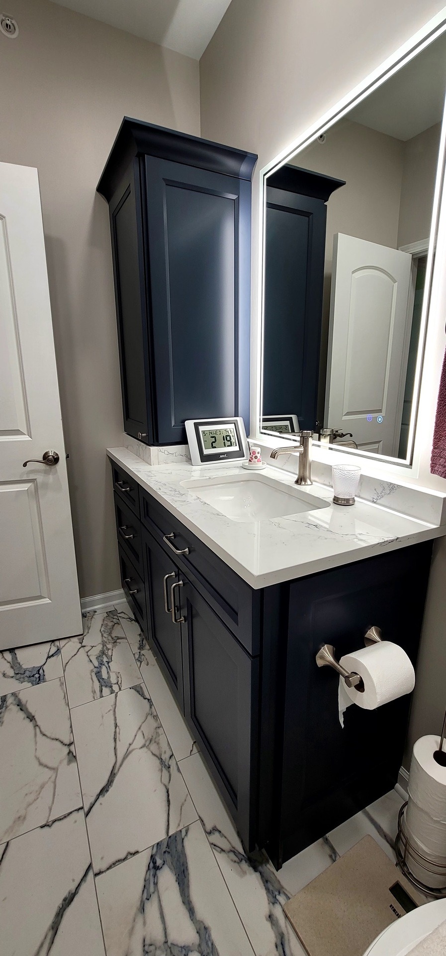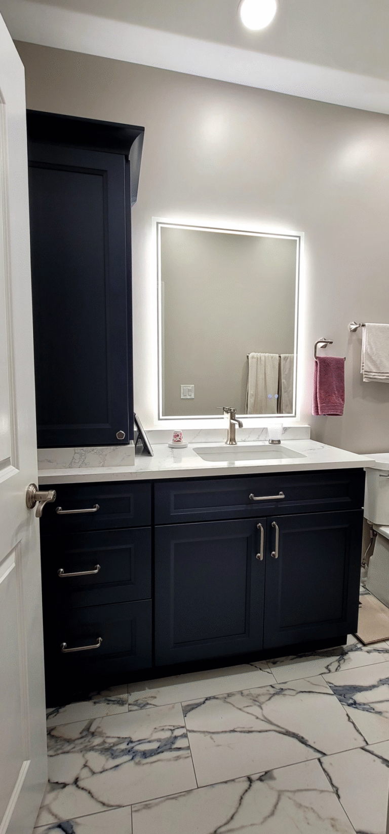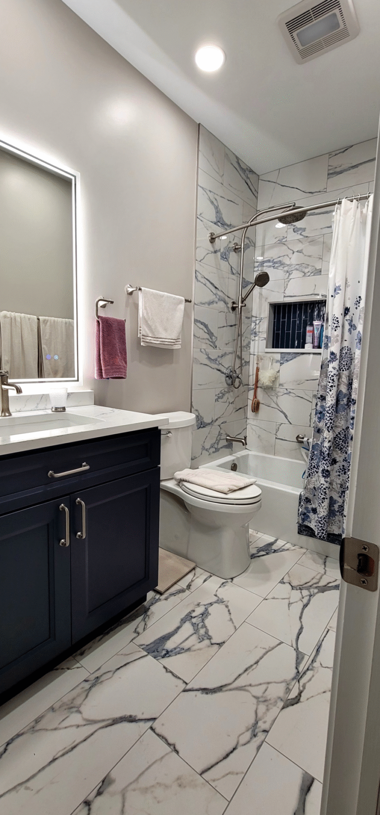 Rich navy cabinetry creates a striking focal point against elegant marble-look tile flooring that flows seamlessly throughout the space. Custom vanity construction maximizes storage potential while maintaining clean, contemporary lines that enhance the bathroom’s overall aesthetic appeal.