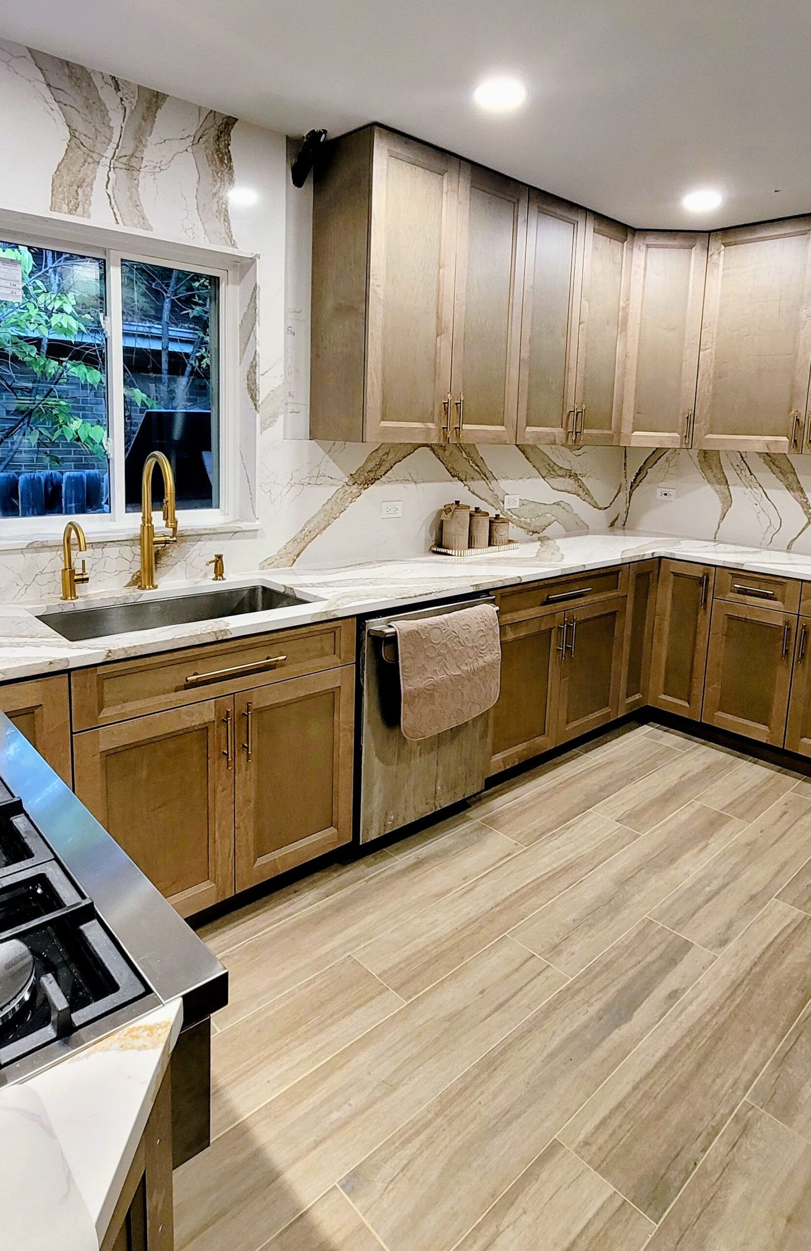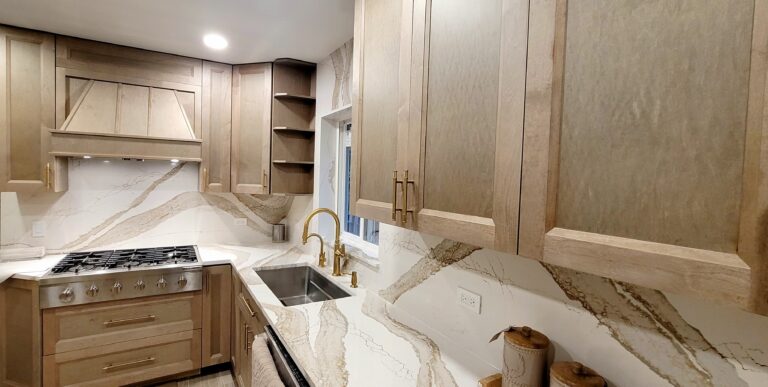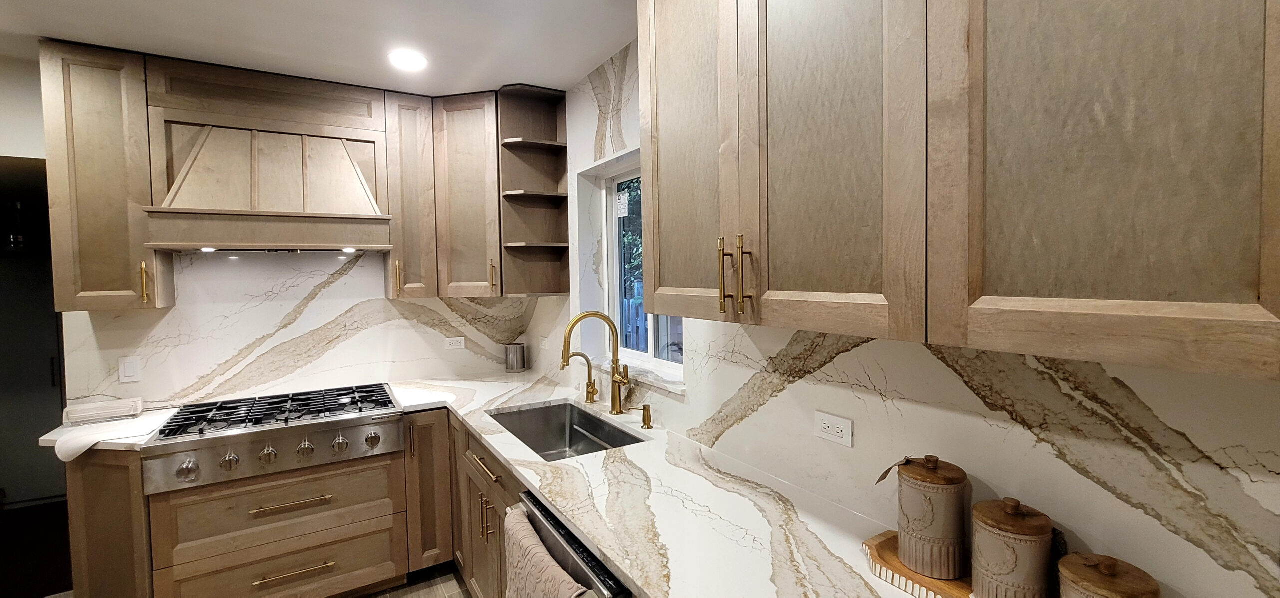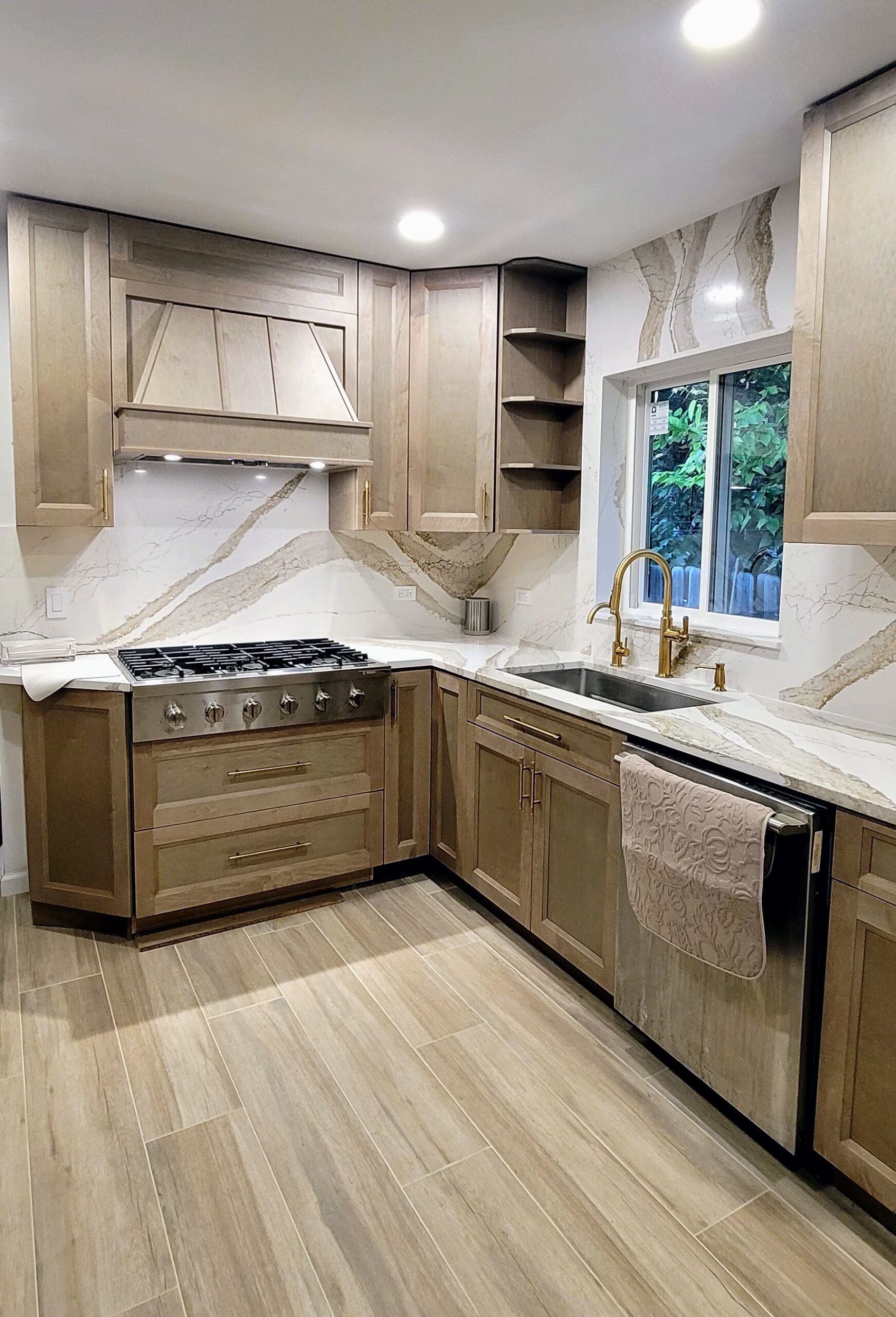 The warm wood custom cabinets and the stunning Cambria countertops make the kitchen feel both welcoming and high-end. Refined touches are added throughout with gold fixtures and hardware. Functionality is maximized with open shelving and clever corner storage. This kitchen now serves as the heart of the home, blending warmth with sophistication.