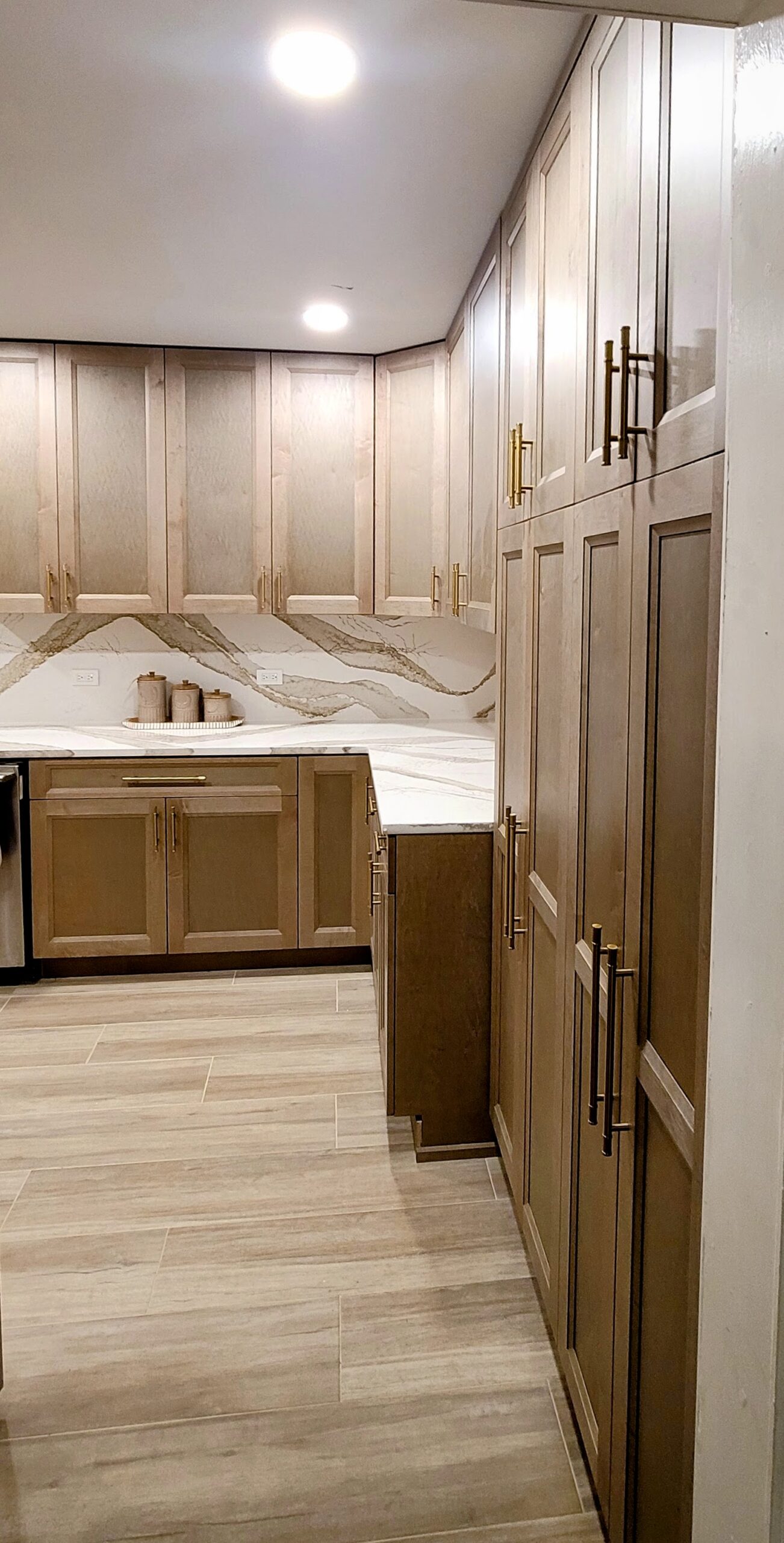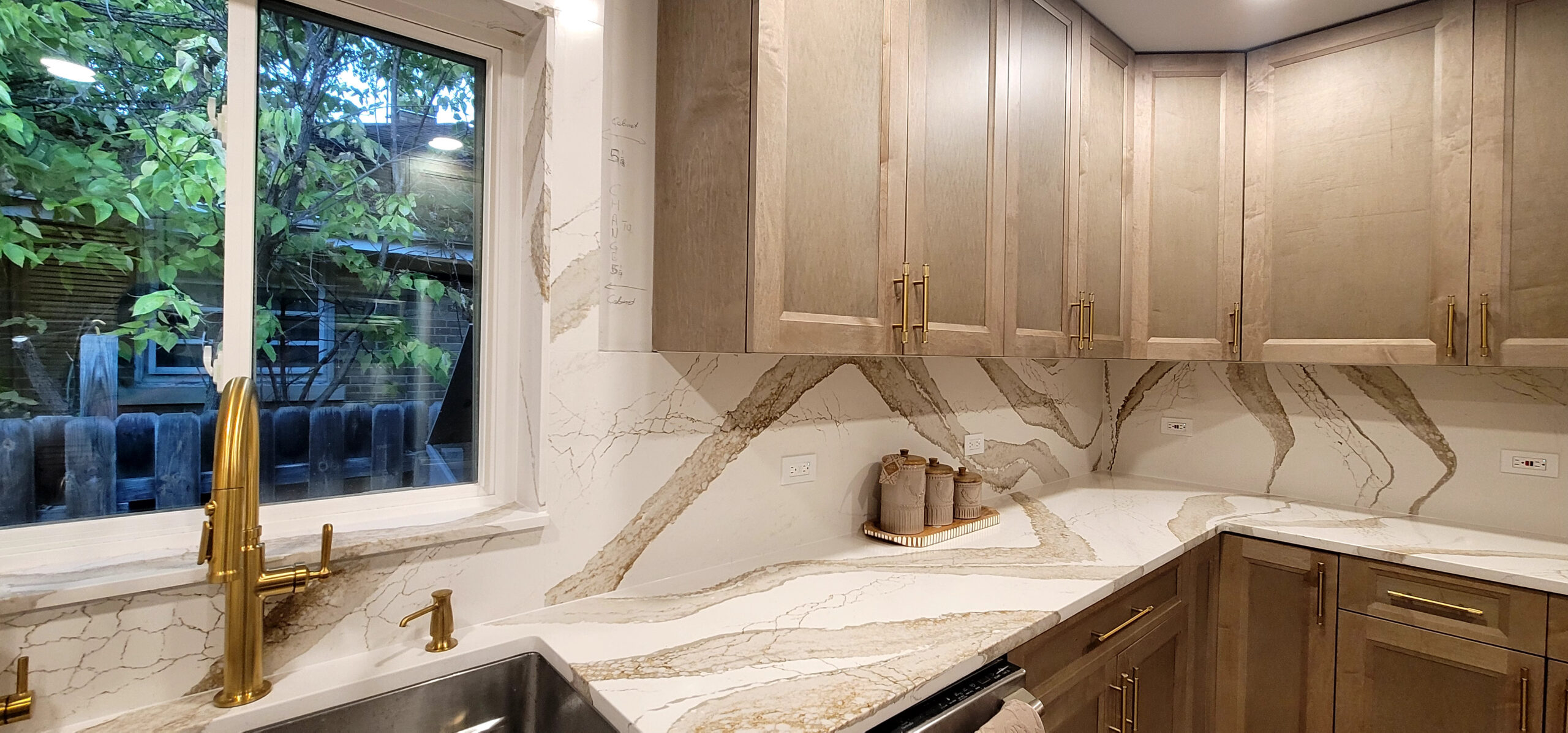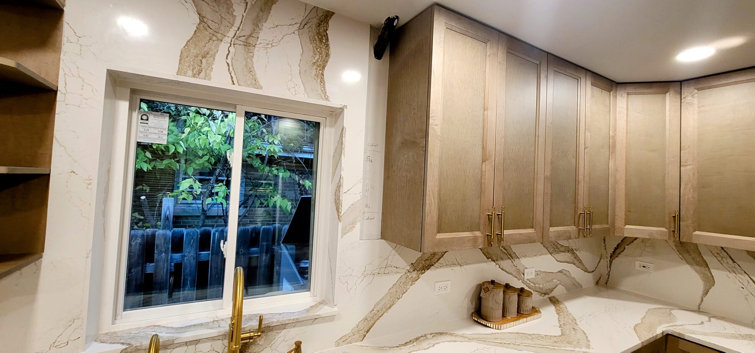 The warm wood custom cabinets and the stunning Cambria countertops make the kitchen feel both welcoming and high-end. Refined touches are added throughout with gold fixtures and hardware. Functionality is maximized with open shelving and clever corner storage. This kitchen now serves as the heart of the home, blending warmth with sophistication.