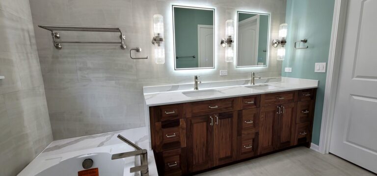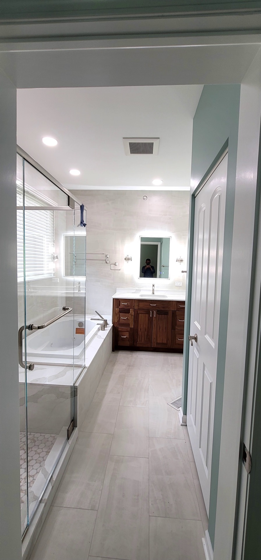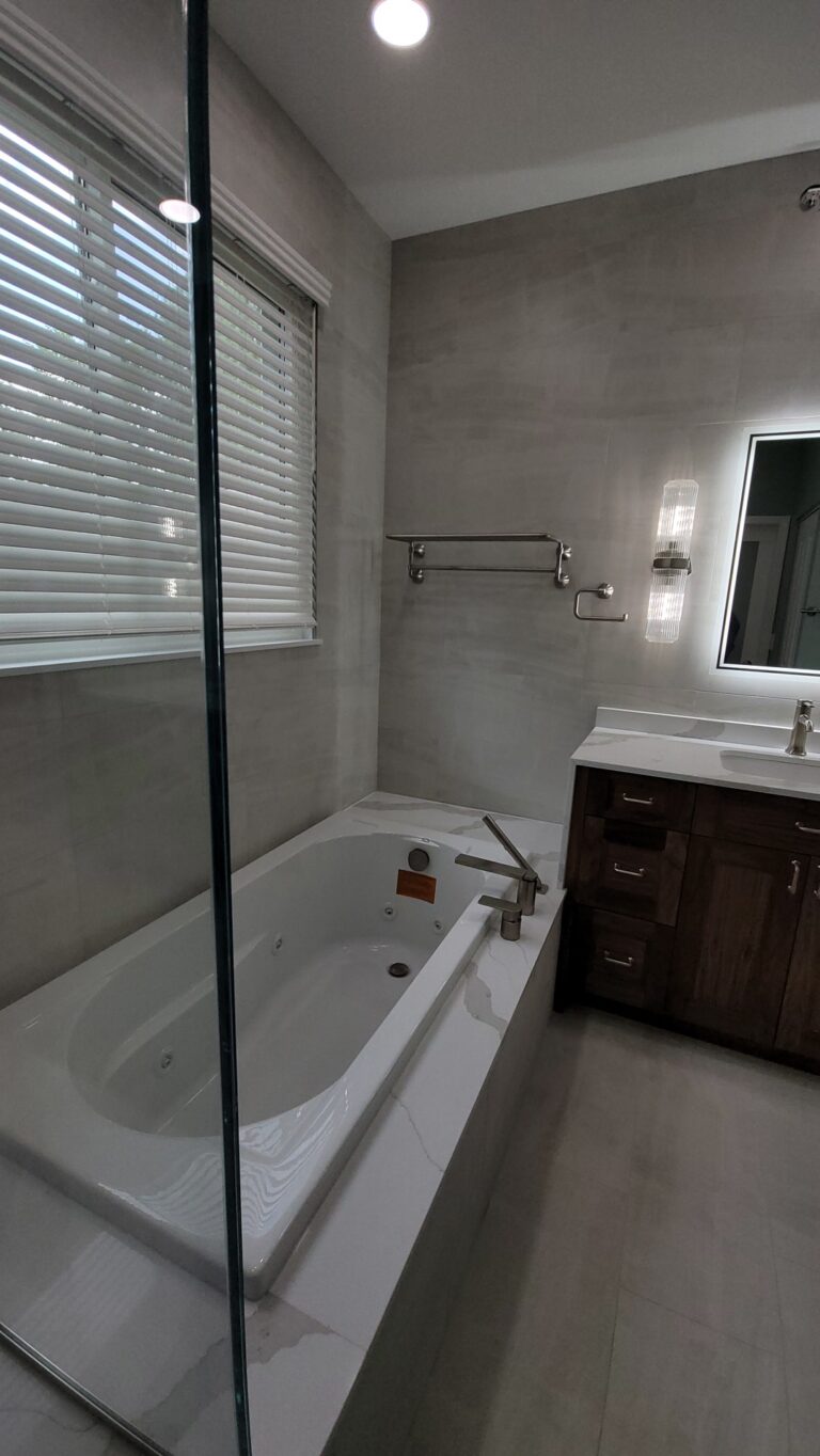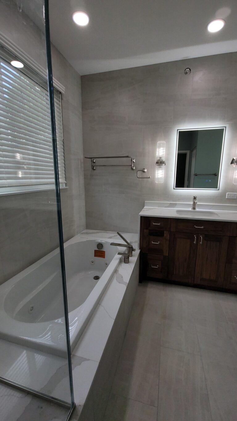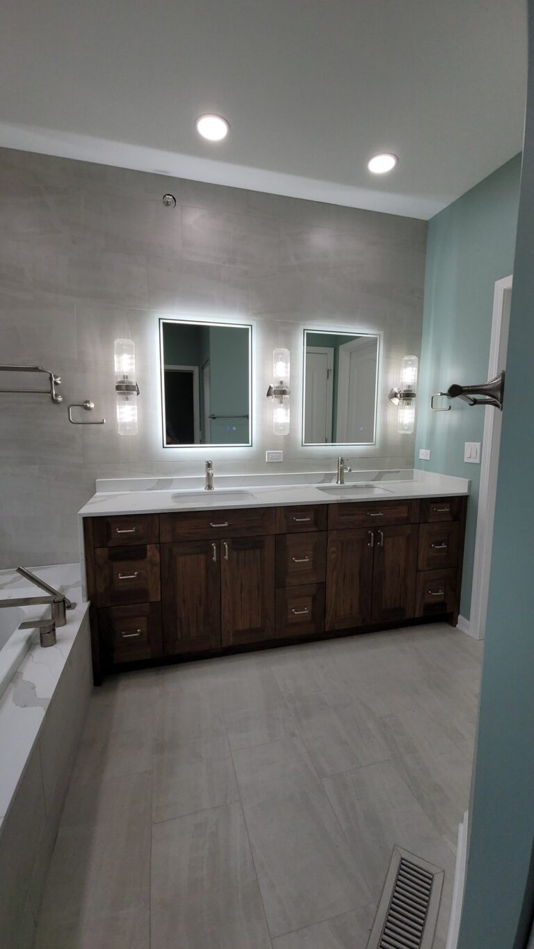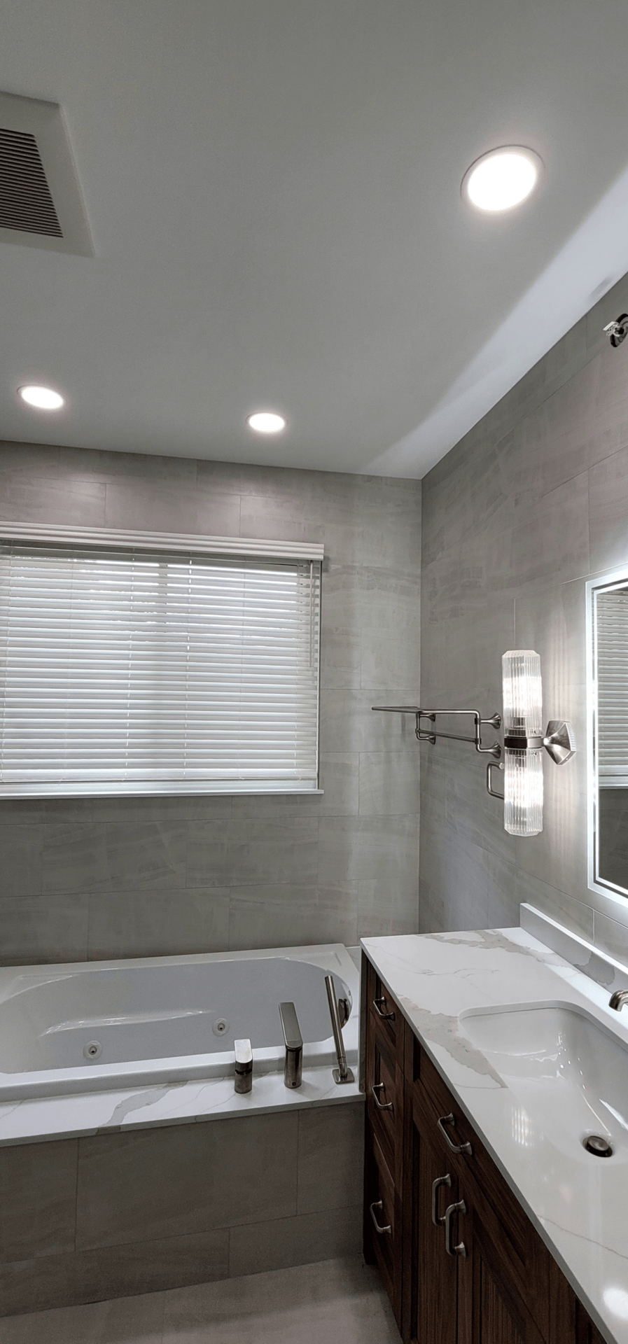Rich walnut cabinetry and marble-look countertops transform everyday routines into luxurious spa experiences in beautiful Hoffman Estates. A spacious jetted tub provides perfect relaxation while the modern glass shower features premium fixtures and elegant design. LED-lit mirrors and stylish sconces create ideal lighting throughout the sophisticated space.