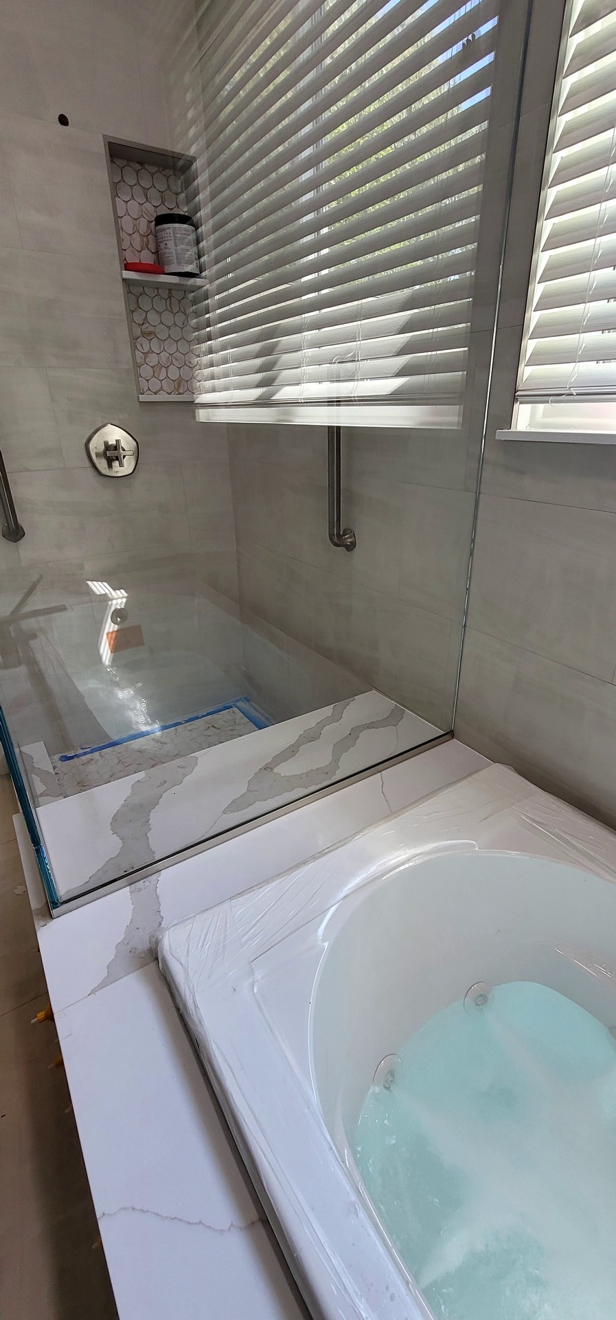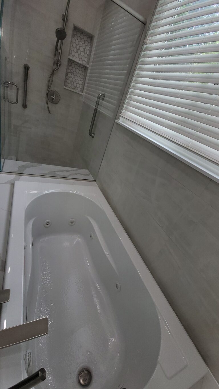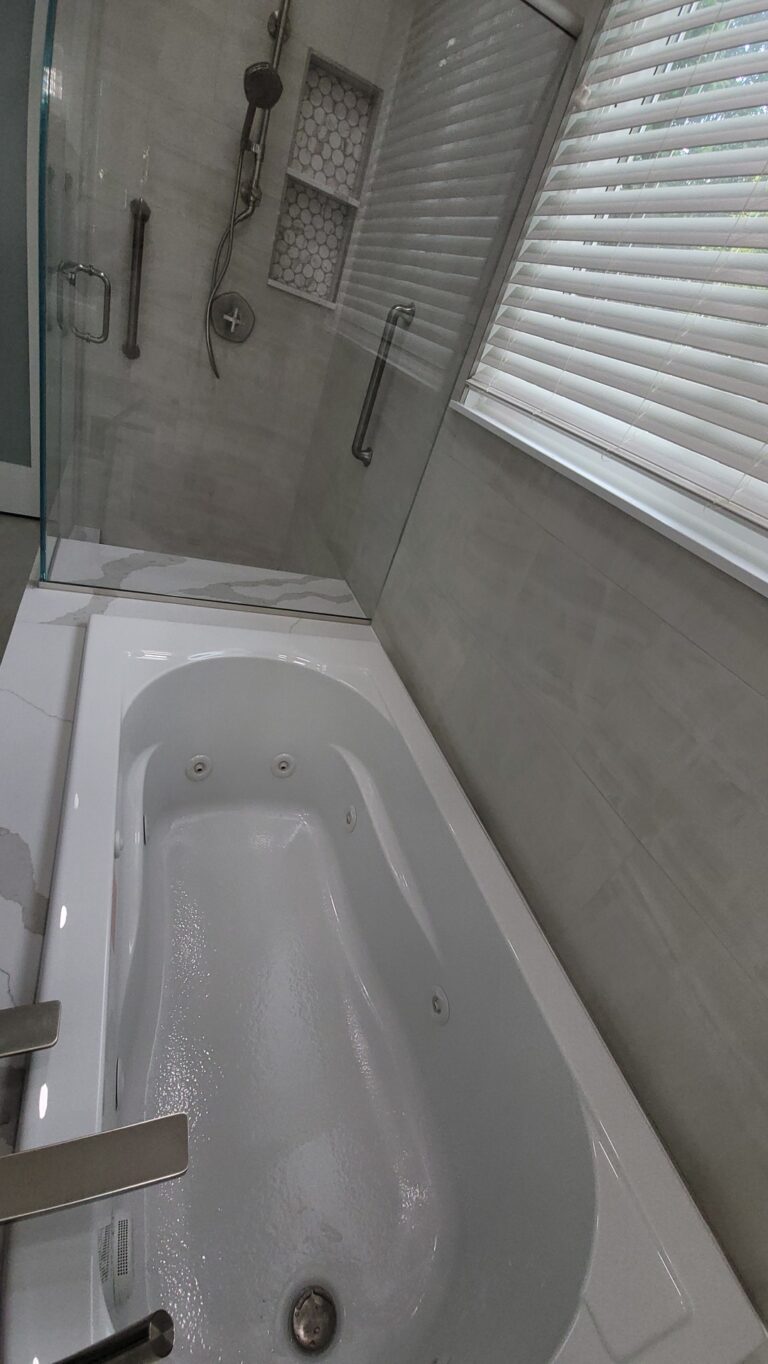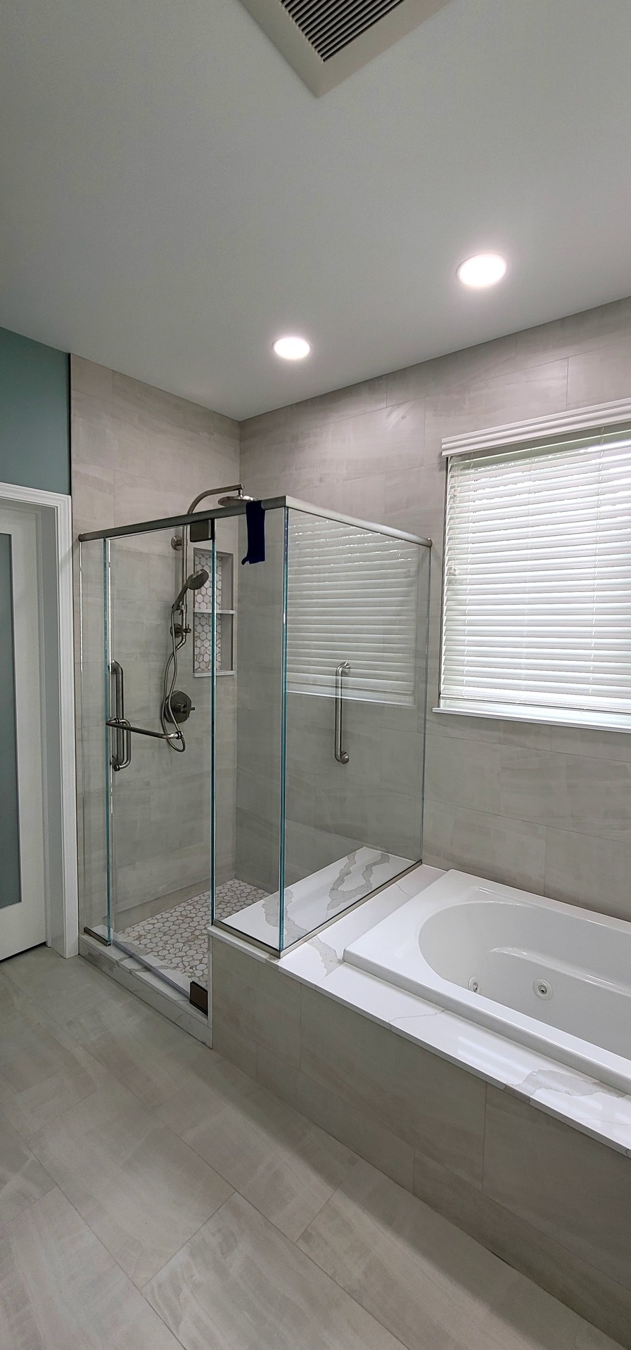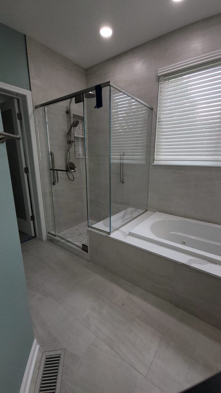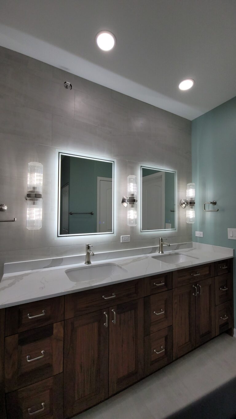Rich walnut cabinetry and marble-look countertops transform everyday routines into luxurious spa experiences in beautiful Hoffman Estates. A spacious jetted tub provides perfect relaxation while the modern glass shower features premium fixtures and elegant design. LED-lit mirrors and stylish sconces create ideal lighting throughout the sophisticated space.