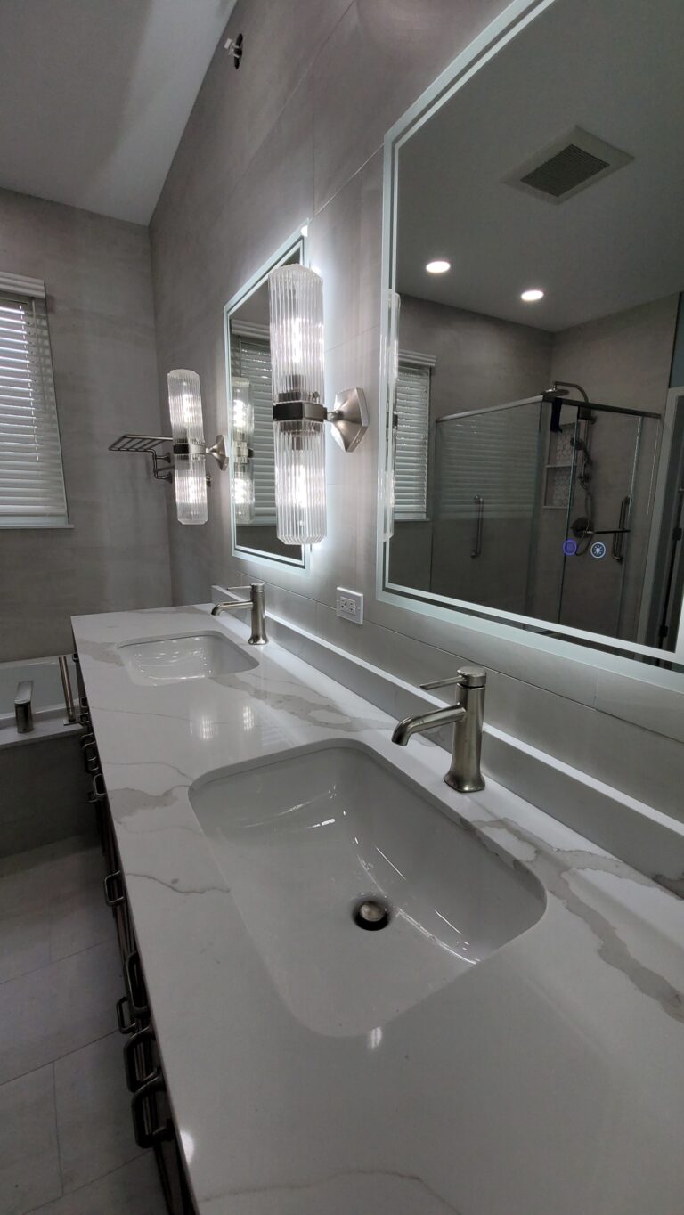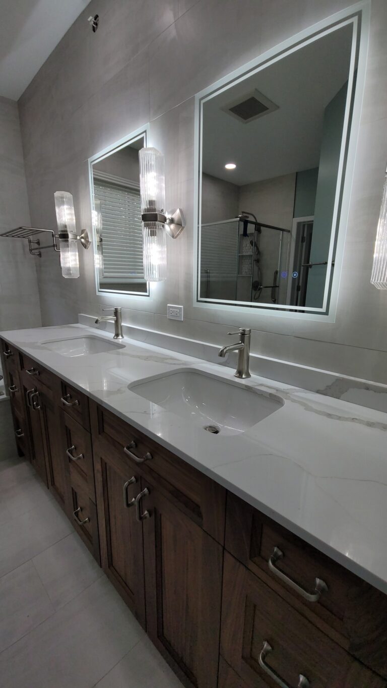 Dual-sink vanity design maximizes both storage and counter space for busy family life. Large format floor tiles and coordinating wall surfaces flow seamlessly throughout the bathroom remodel. Professional-grade plumbing fixtures and quality materials ensure lasting performance while maintaining the refined aesthetic that defines luxury living.