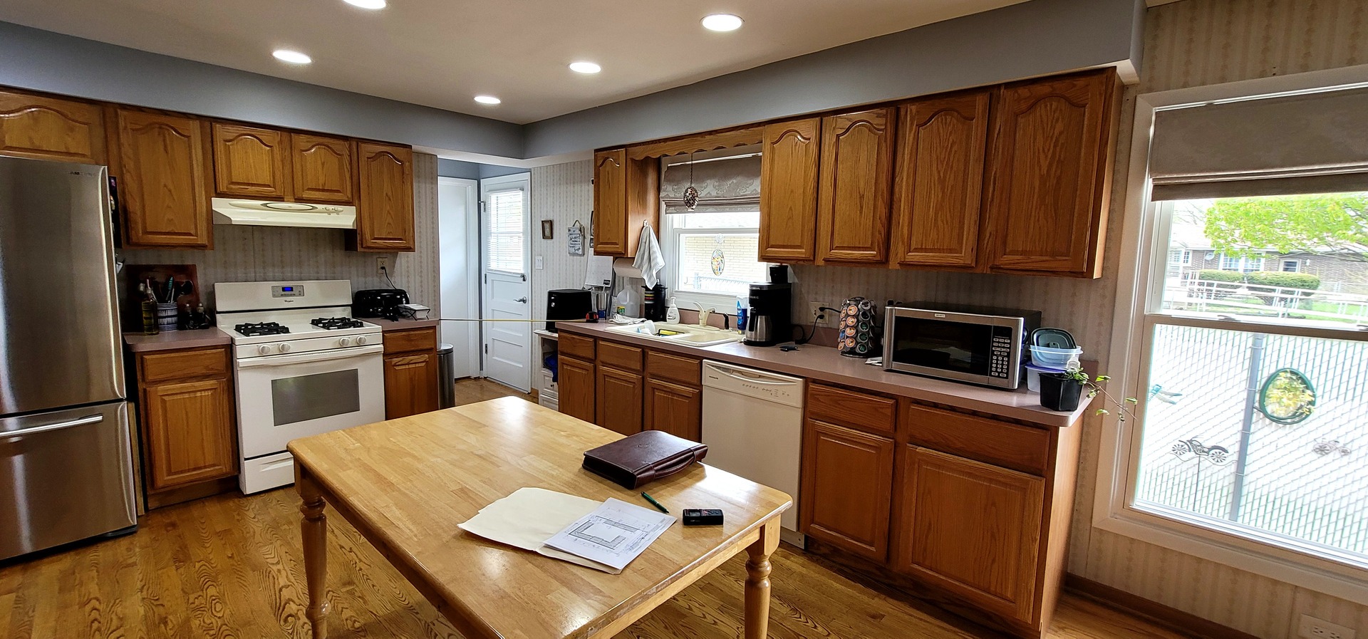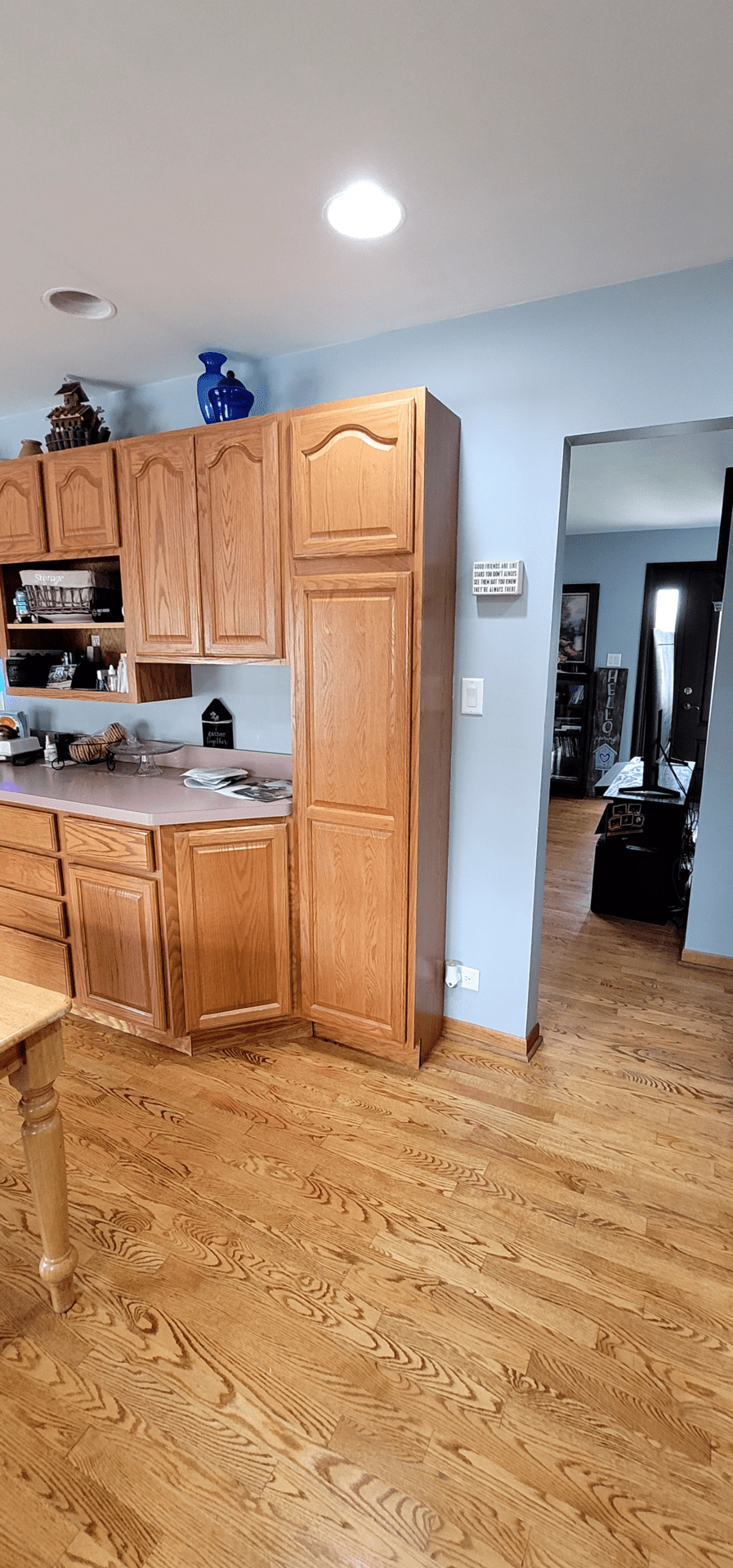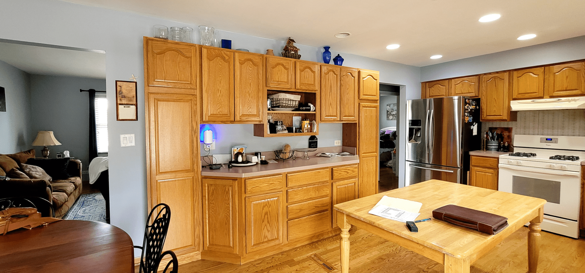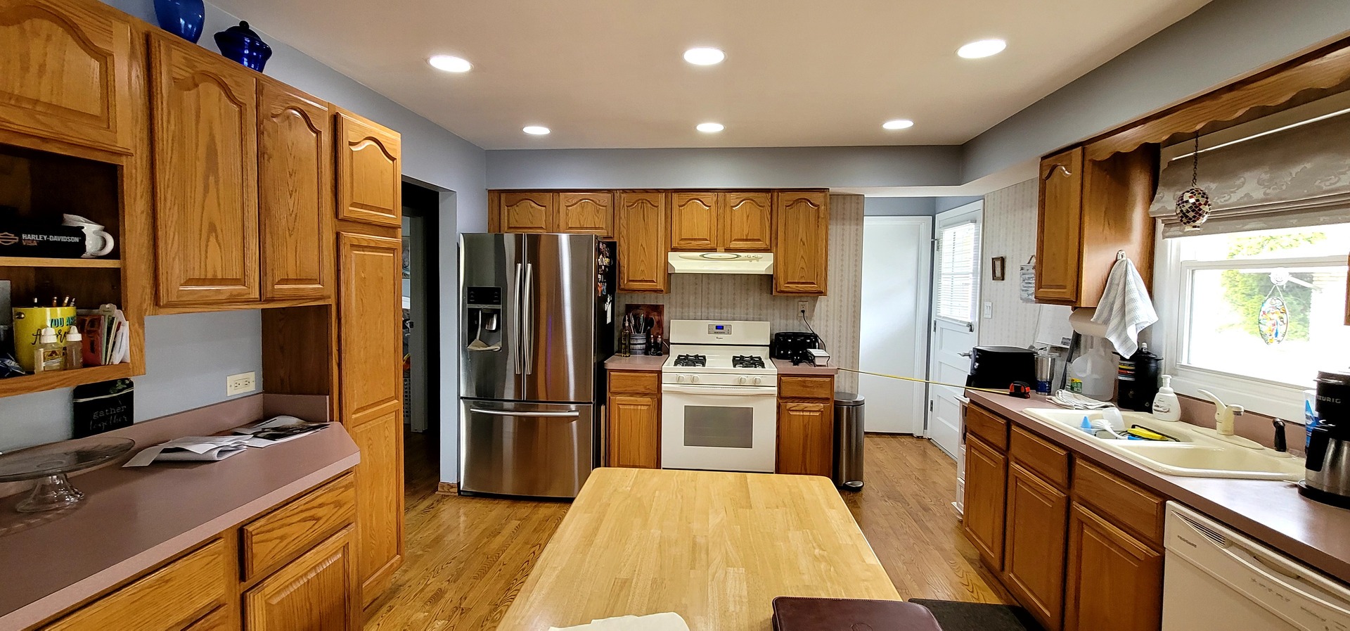 Warm but worn, the original kitchen featured golden oak cabinets, bulky tiled countertops, and lighting that left the space feeling dull. The layout was disjointed, and the finishes had lost their charm. It no longer supported how the homeowners wanted to cook, gather, or live in the space.