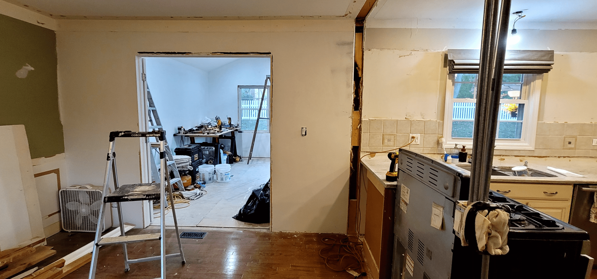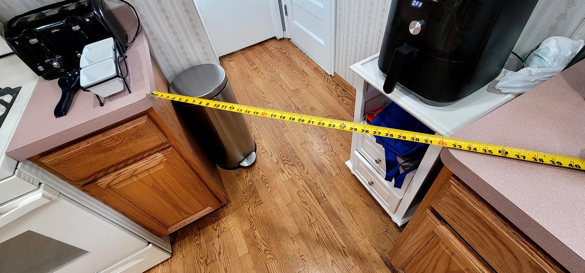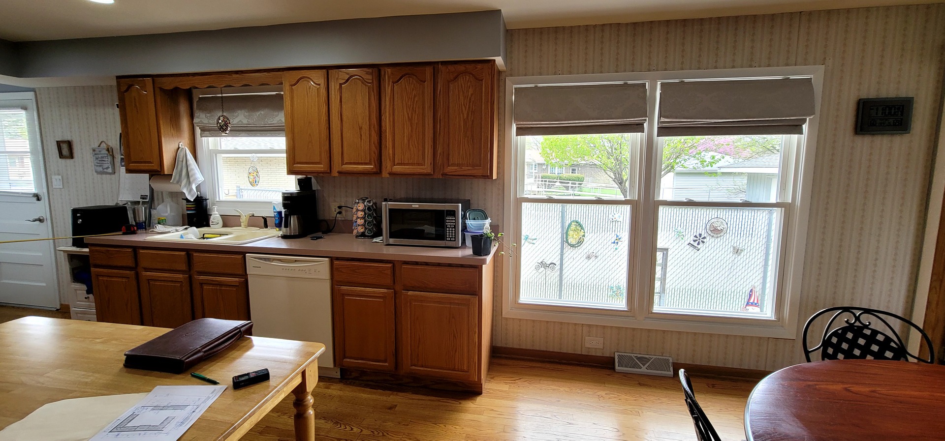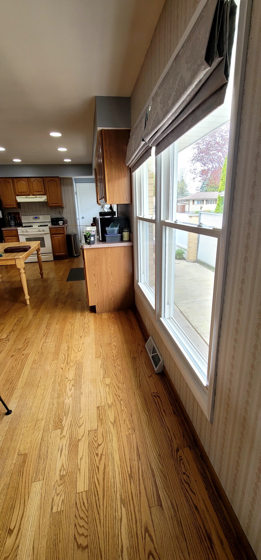 Warm but worn, the original kitchen featured golden oak cabinets, bulky tiled countertops, and lighting that left the space feeling dull. The layout was disjointed, and the finishes had lost their charm. It no longer supported how the homeowners wanted to cook, gather, or live in the space.