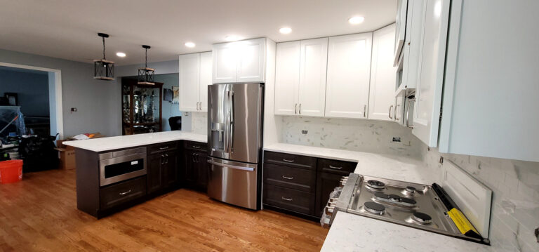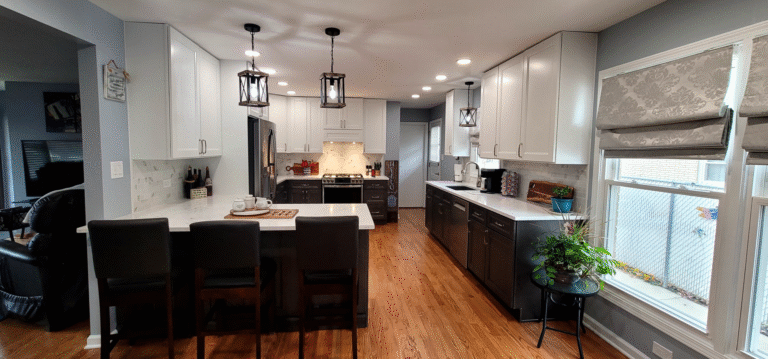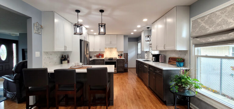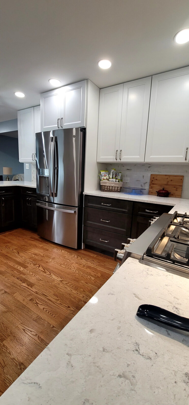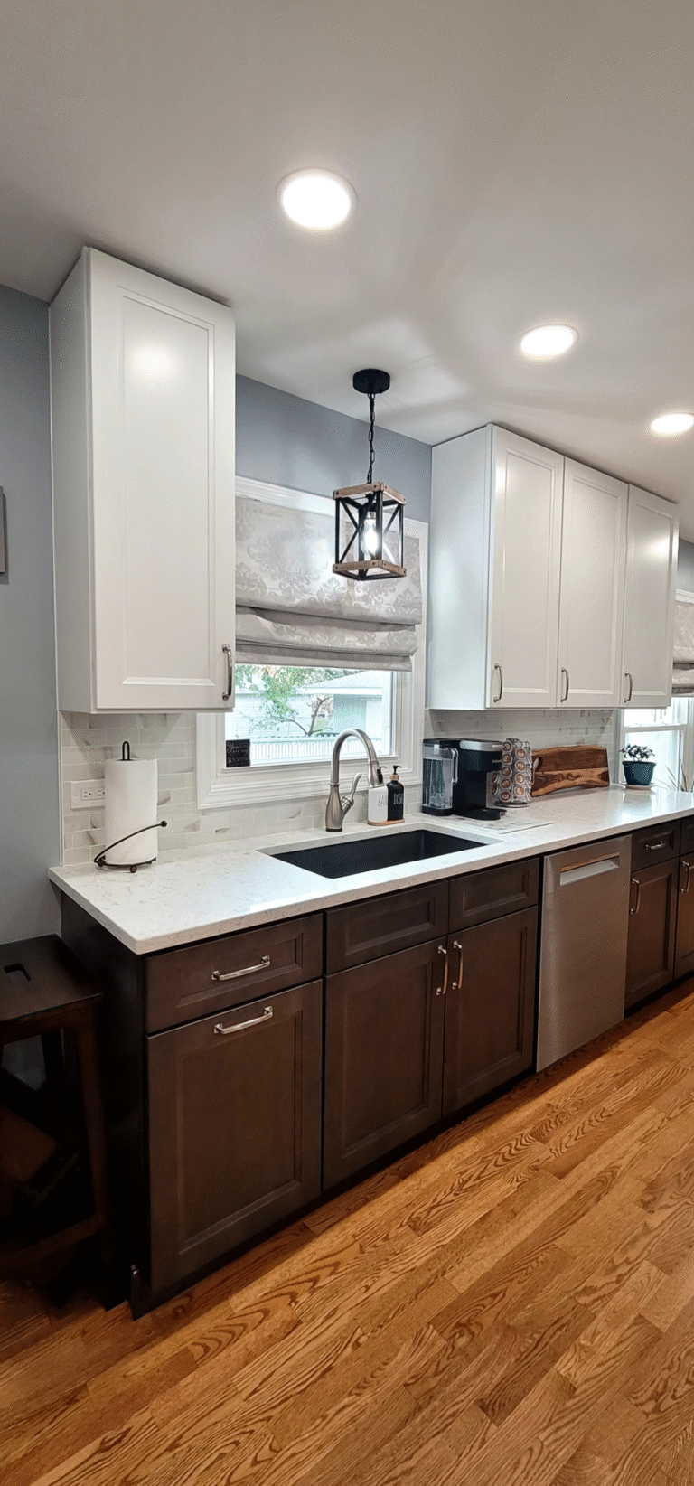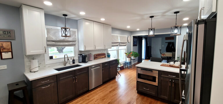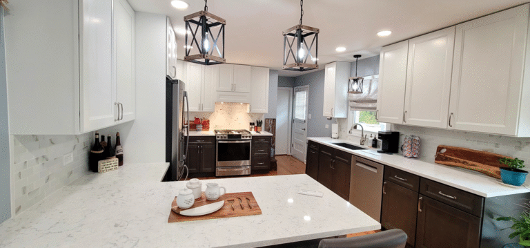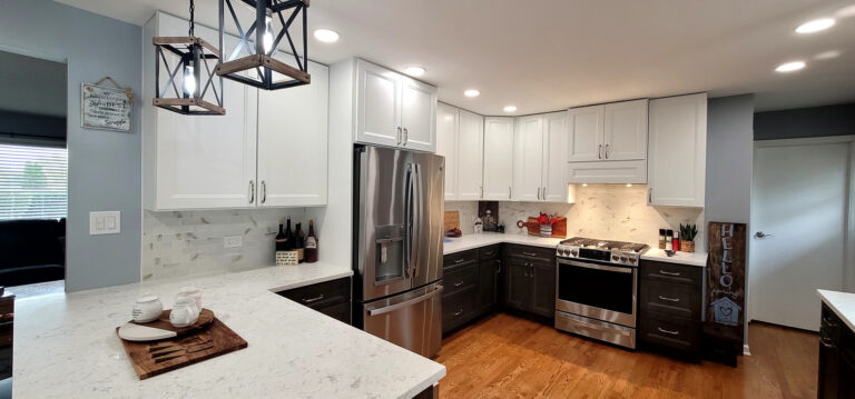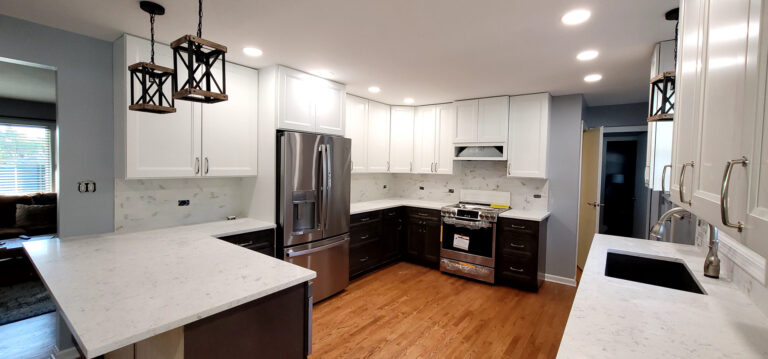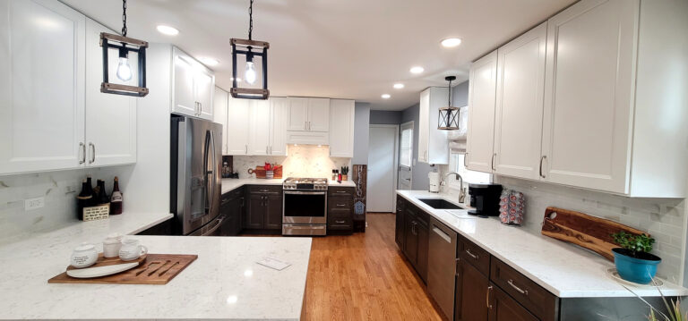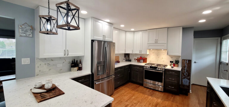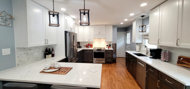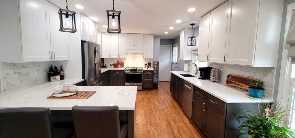 The remodel introduced white upper cabinets paired with rich dark lowers, creating a clean and elegant contrast. Sleek quartz countertops brought in a refined look with added durability. New lighting fixtures enhanced the brightness and ambiance, while updated appliances and a soft backsplash completed the transformation with both style and function in mind.