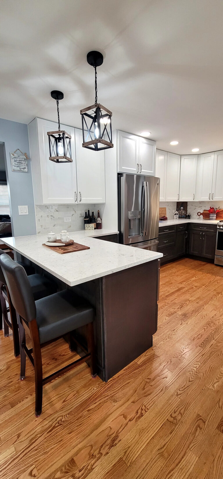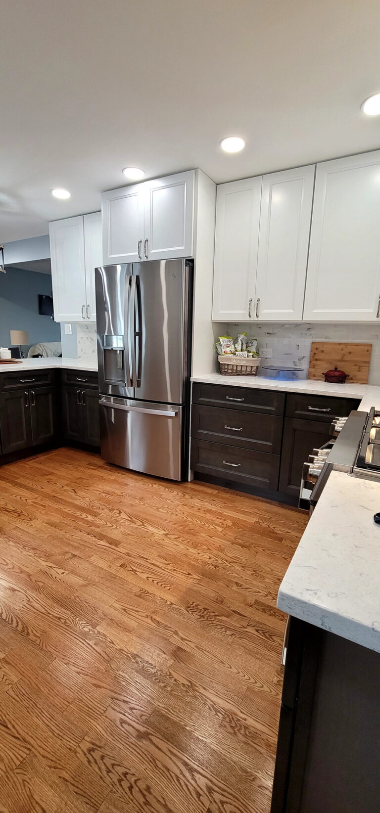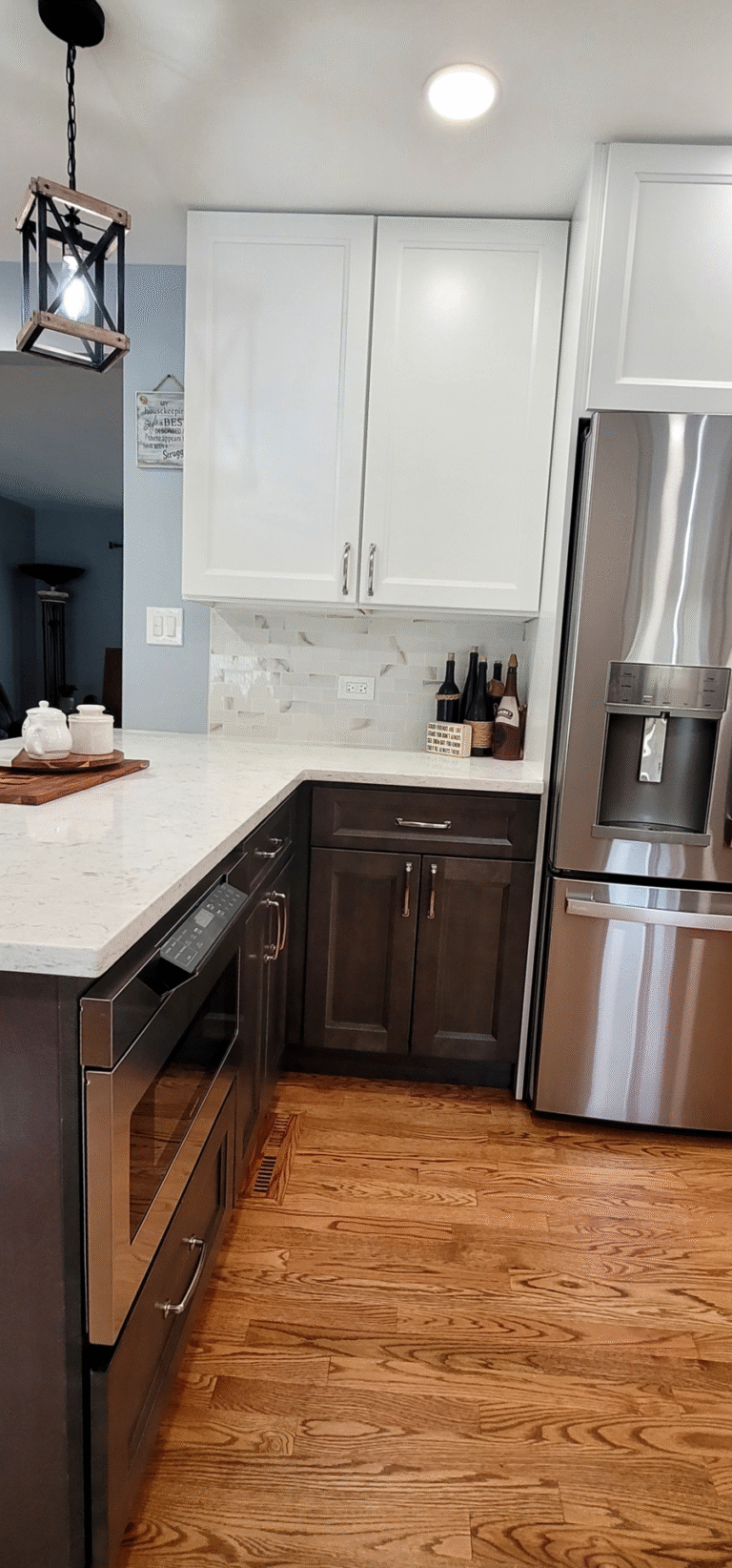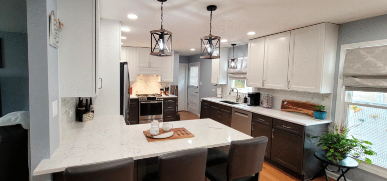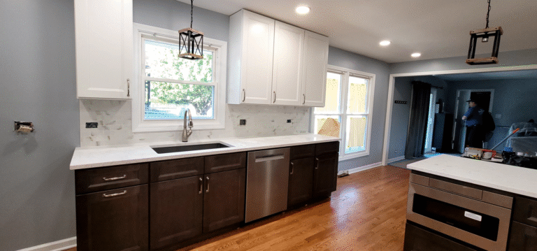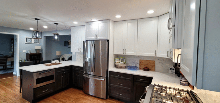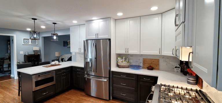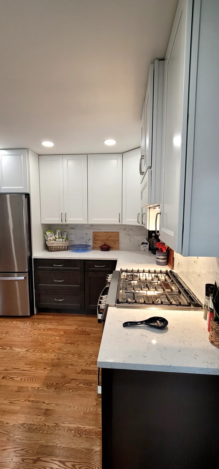 The remodel introduced white upper cabinets paired with rich dark lowers, creating a clean and elegant contrast. Sleek quartz countertops brought in a refined look with added durability. New lighting fixtures enhanced the brightness and ambiance, while updated appliances and a soft backsplash completed the transformation with both style and function in mind.