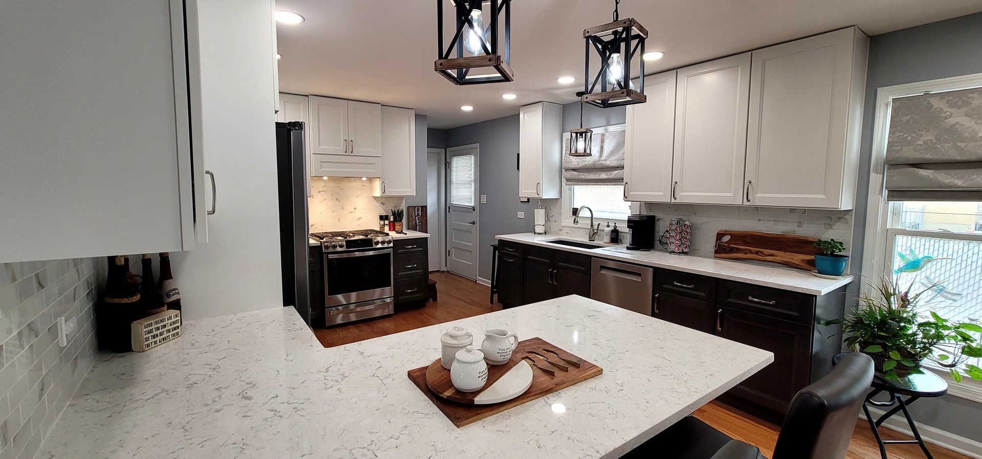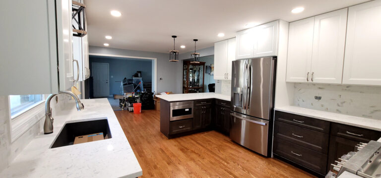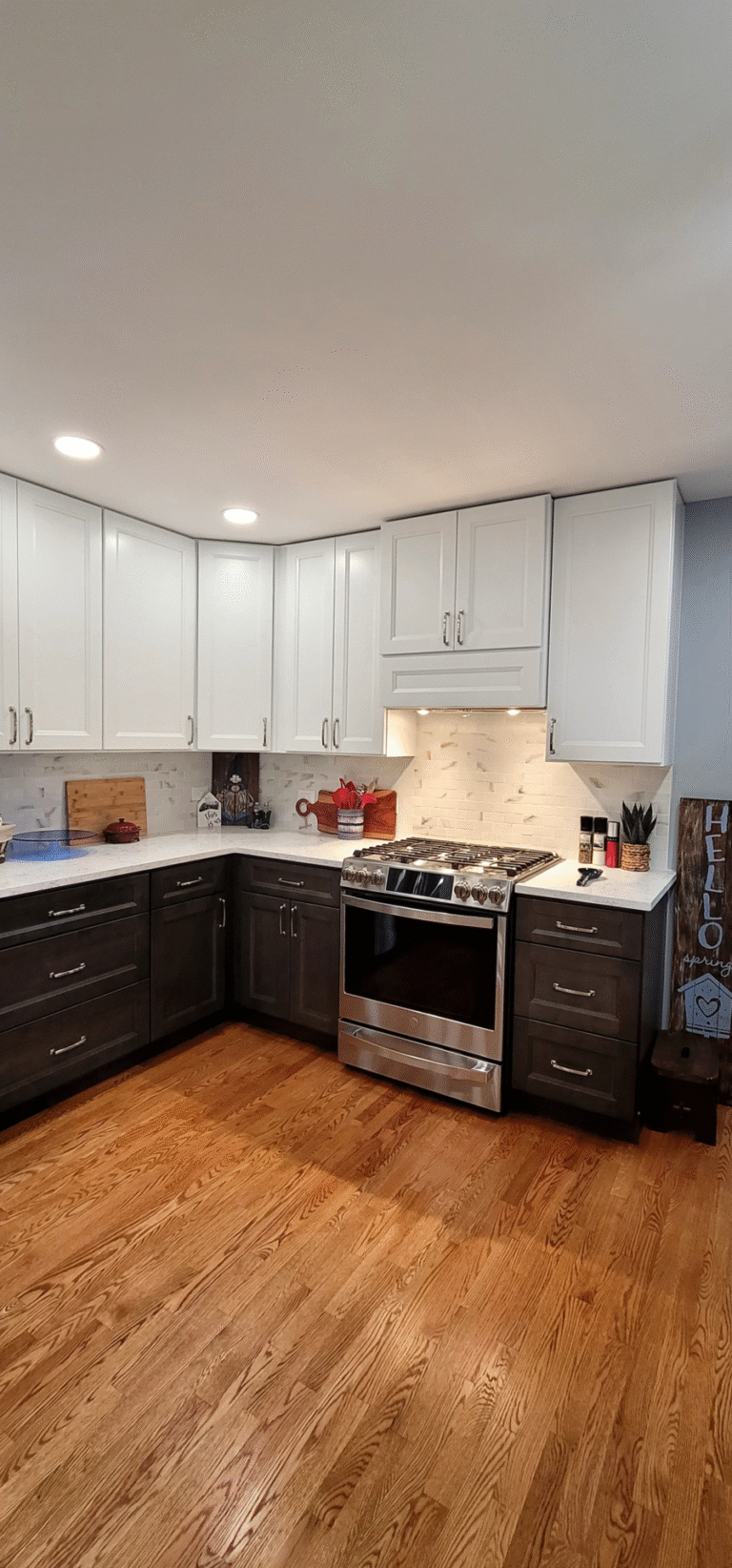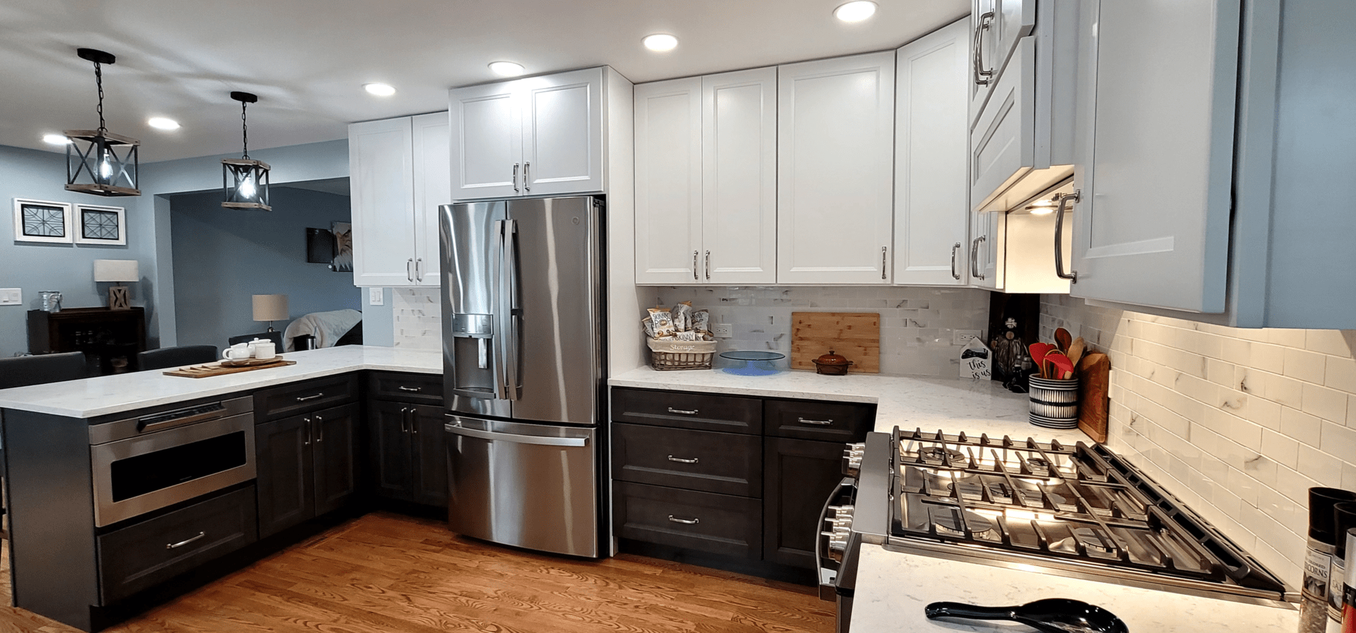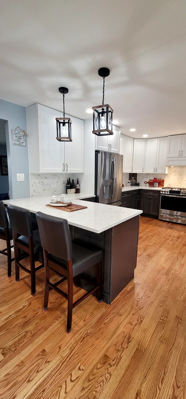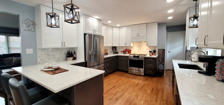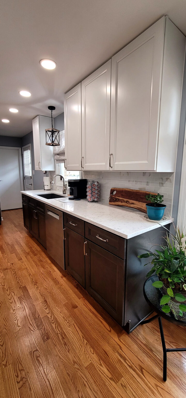 The remodel introduced white upper cabinets paired with rich dark lowers, creating a clean and elegant contrast. Sleek quartz countertops brought in a refined look with added durability. New lighting fixtures enhanced the brightness and ambiance, while updated appliances and a soft backsplash completed the transformation with both style and function in mind.