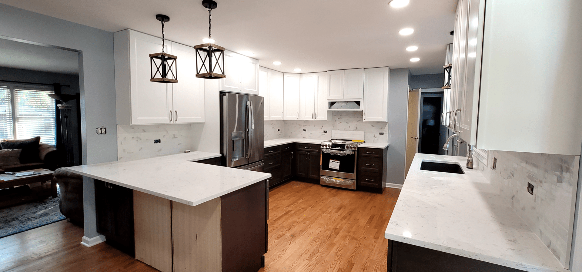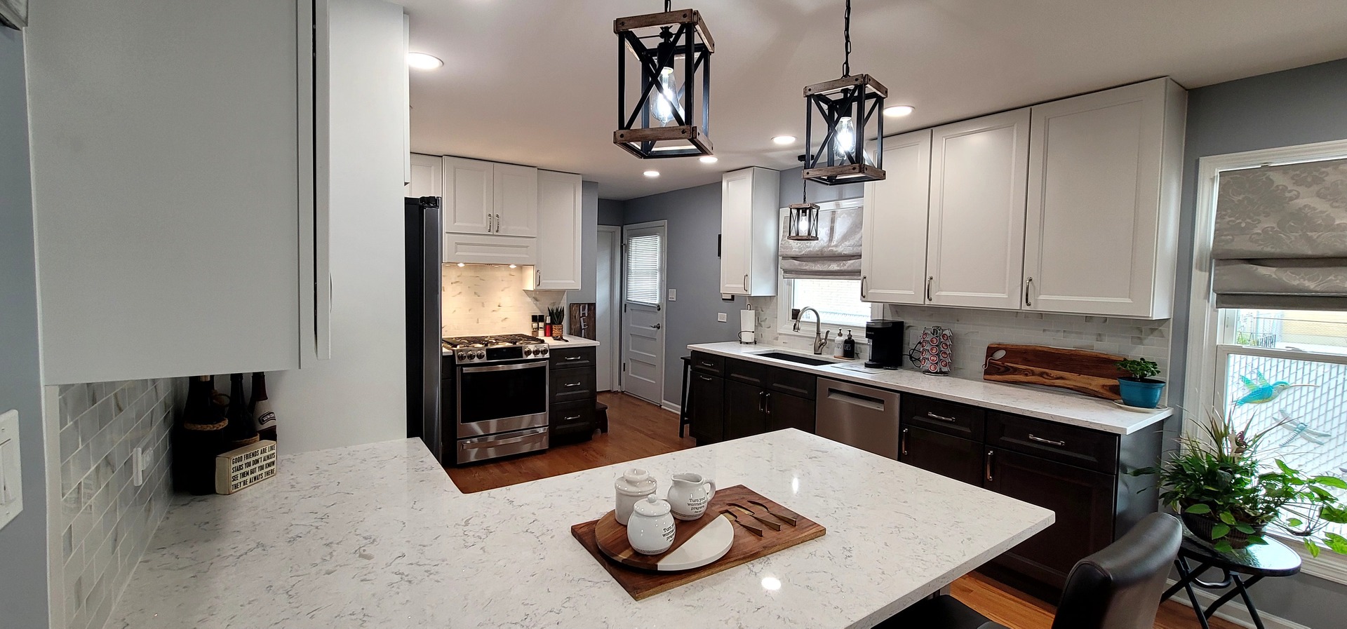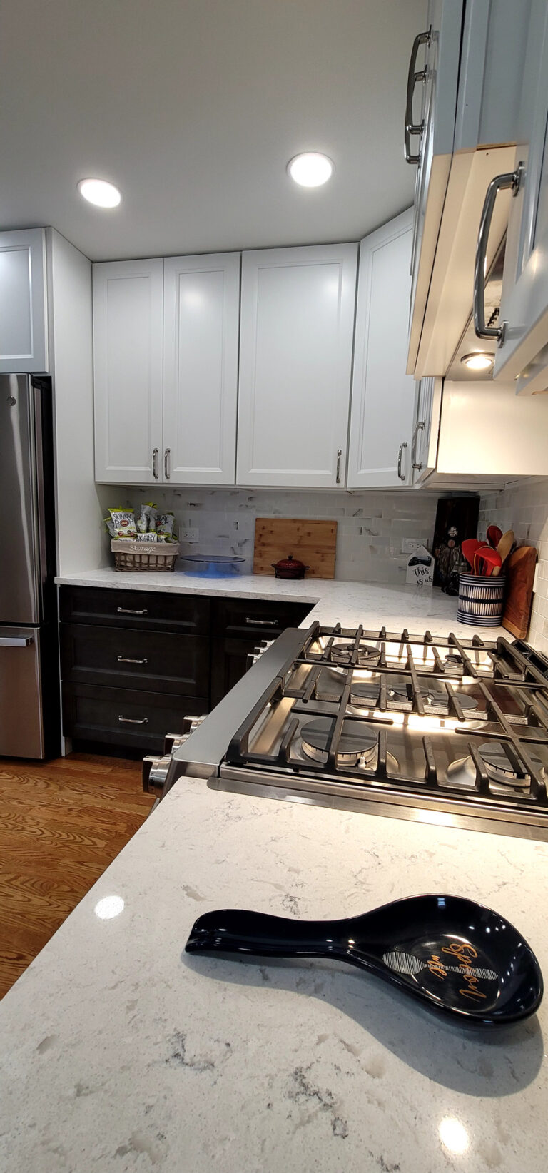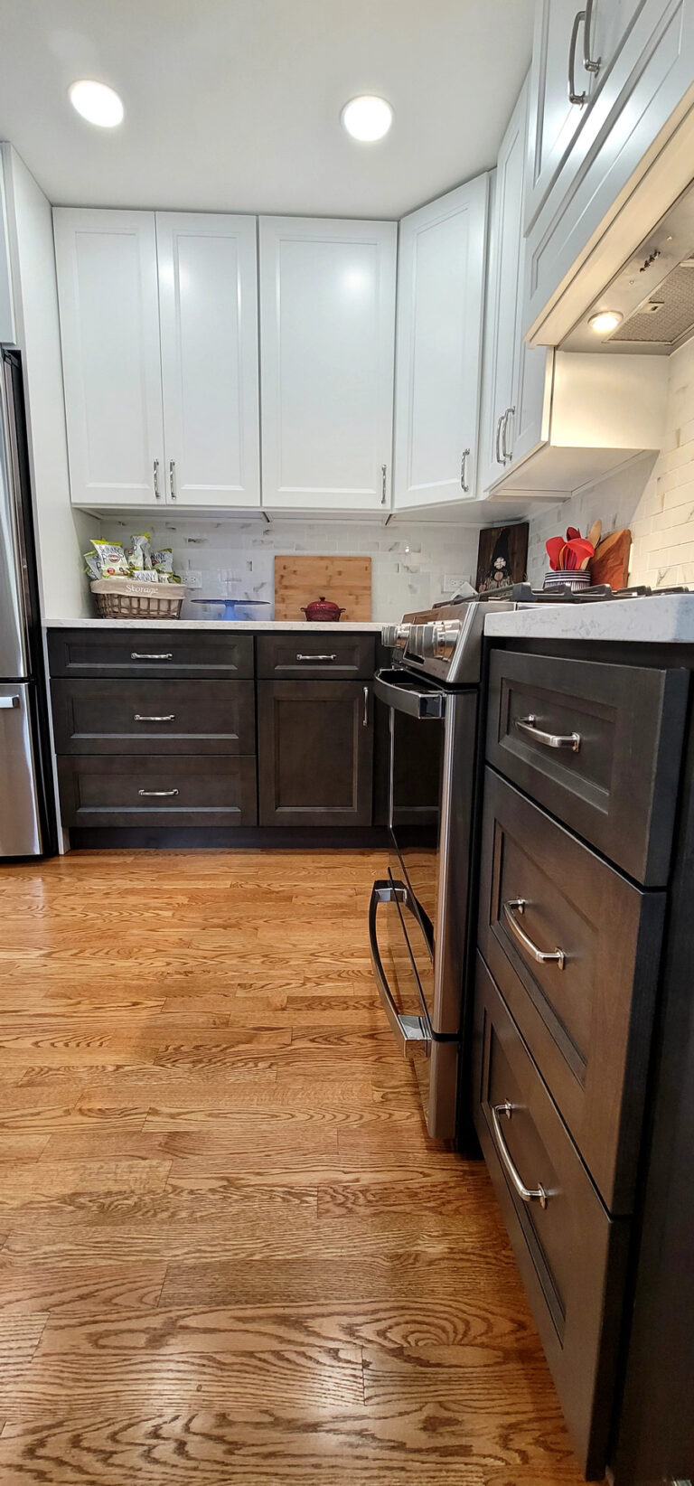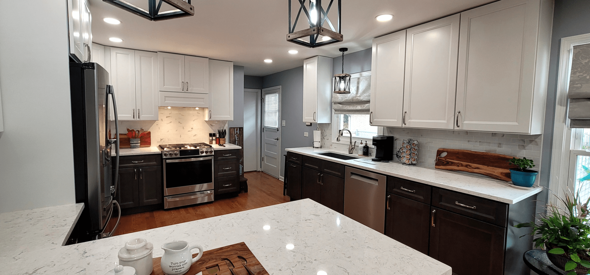 The remodel introduced white upper cabinets paired with rich dark lowers, creating a clean and elegant contrast. Sleek quartz countertops brought in a refined look with added durability. New lighting fixtures enhanced the brightness and ambiance, while updated appliances and a soft backsplash completed the transformation with both style and function in mind.