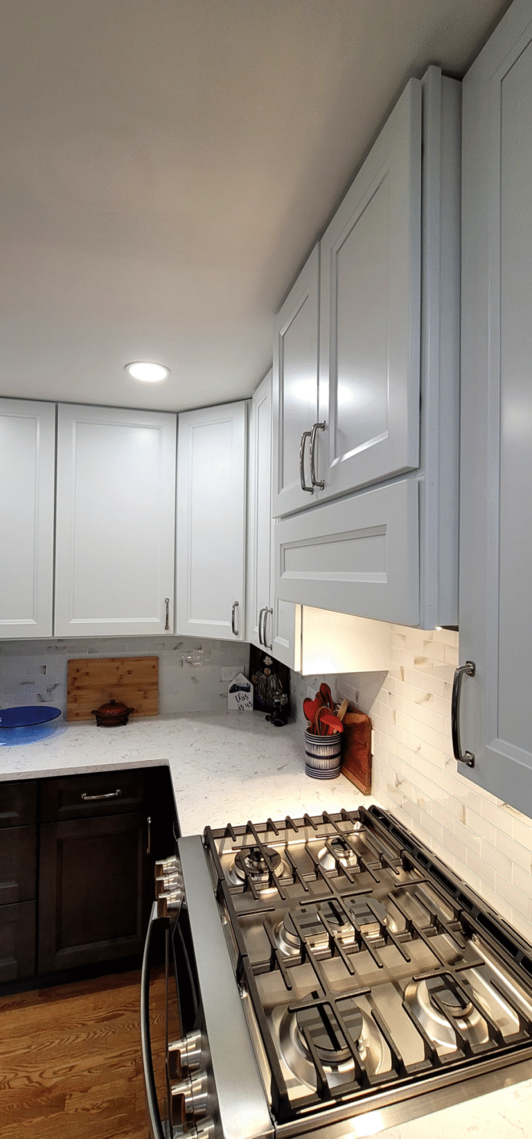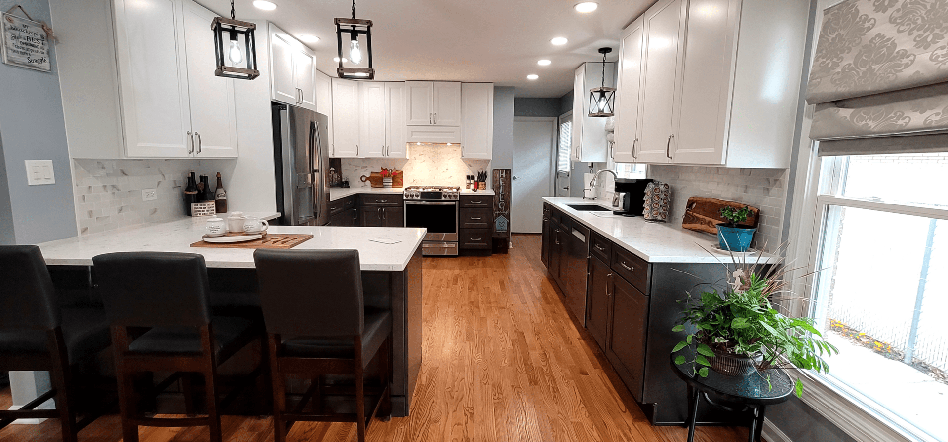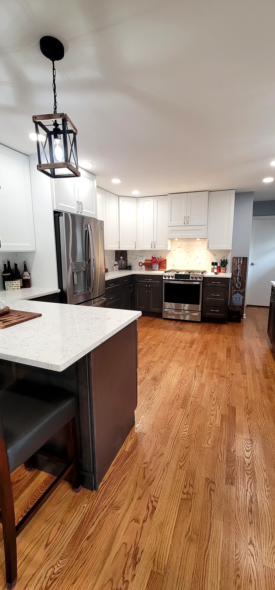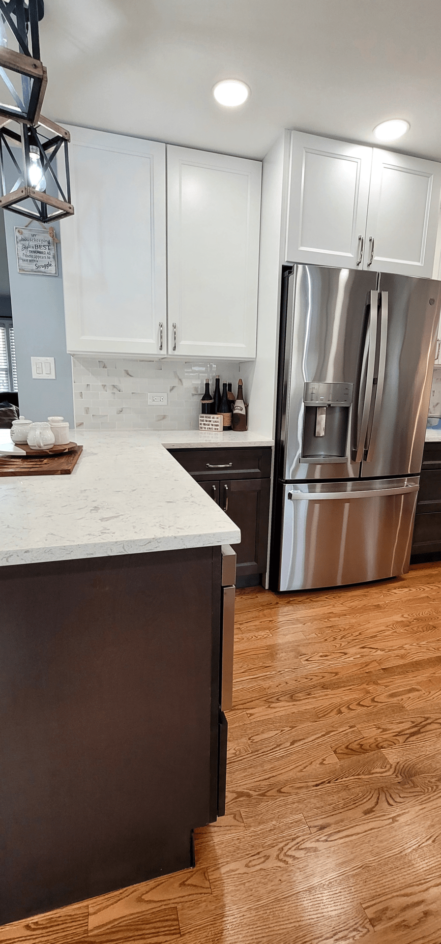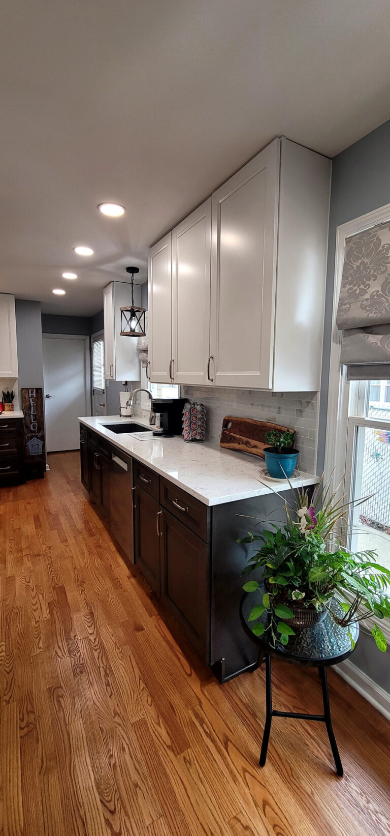 The remodel introduced white upper cabinets paired with rich dark lowers, creating a clean and elegant contrast. Sleek quartz countertops brought in a refined look with added durability. New lighting fixtures enhanced the brightness and ambiance, while updated appliances and a soft backsplash completed the transformation with both style and function in mind.