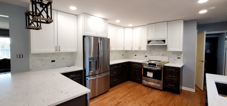 Golden oak cabinets, tiled counters, and dim lighting were replaced with crisp finishes and brighter flow. The Addison IL kitchen remodel now features a stunning contrast of cabinetry, smooth quartz surfaces, and efficient layout. A once dated kitchen is now a functional and elegant centerpiece that reflects modern living.