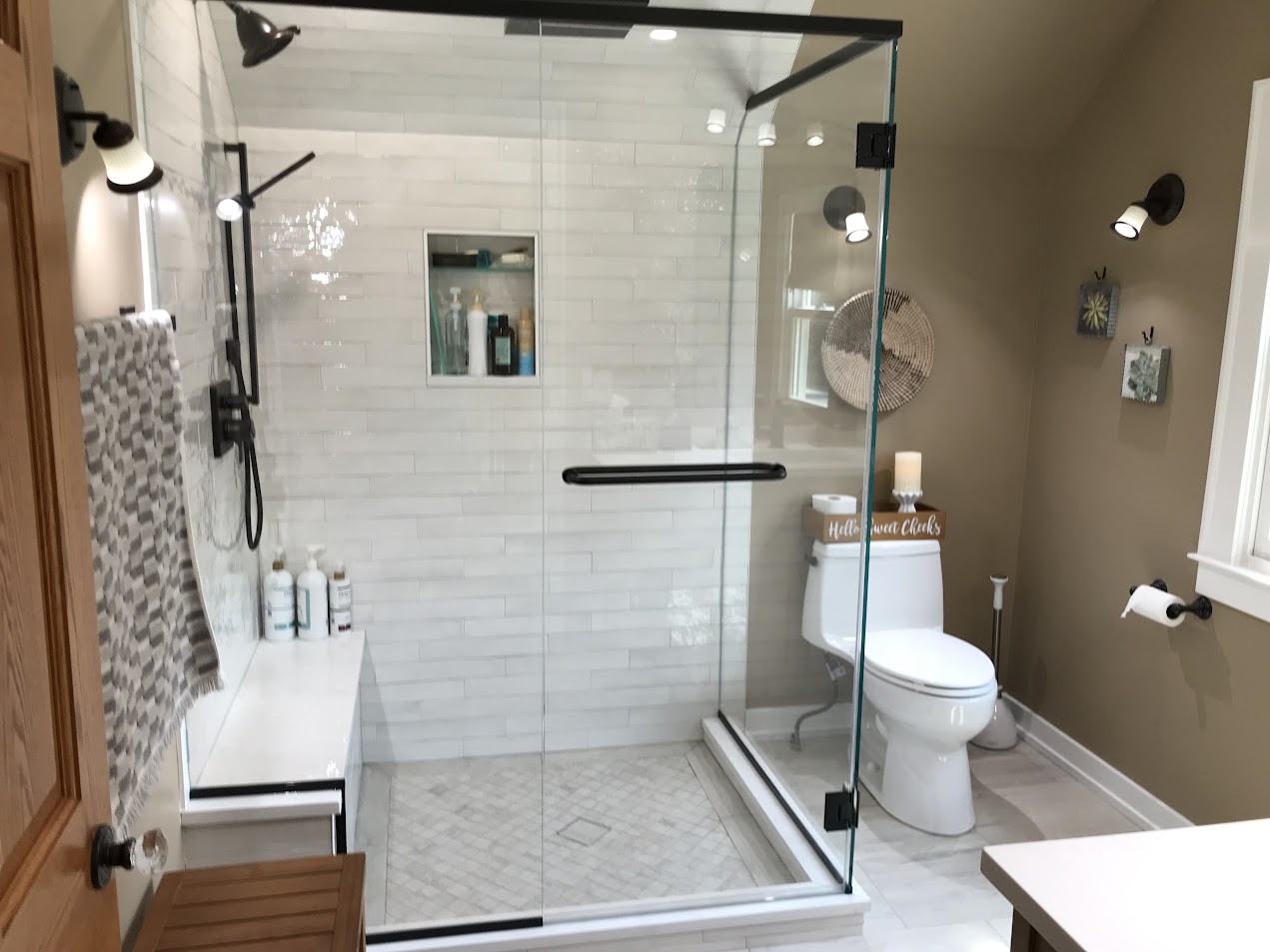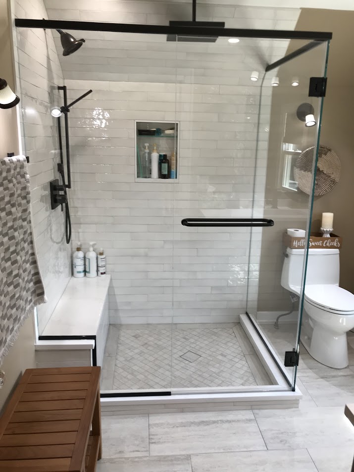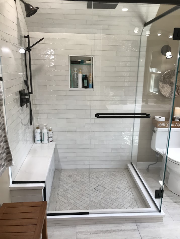 The spacious walk-in shower serves as the focal point, showcasing clean white subway tile from floor to ceiling. Key features include a built-in storage niche, corner bench seating, and glass enclosure that brightens the entire space. Black fixtures and safety grab bar complement the modern design while ensuring accessibility.