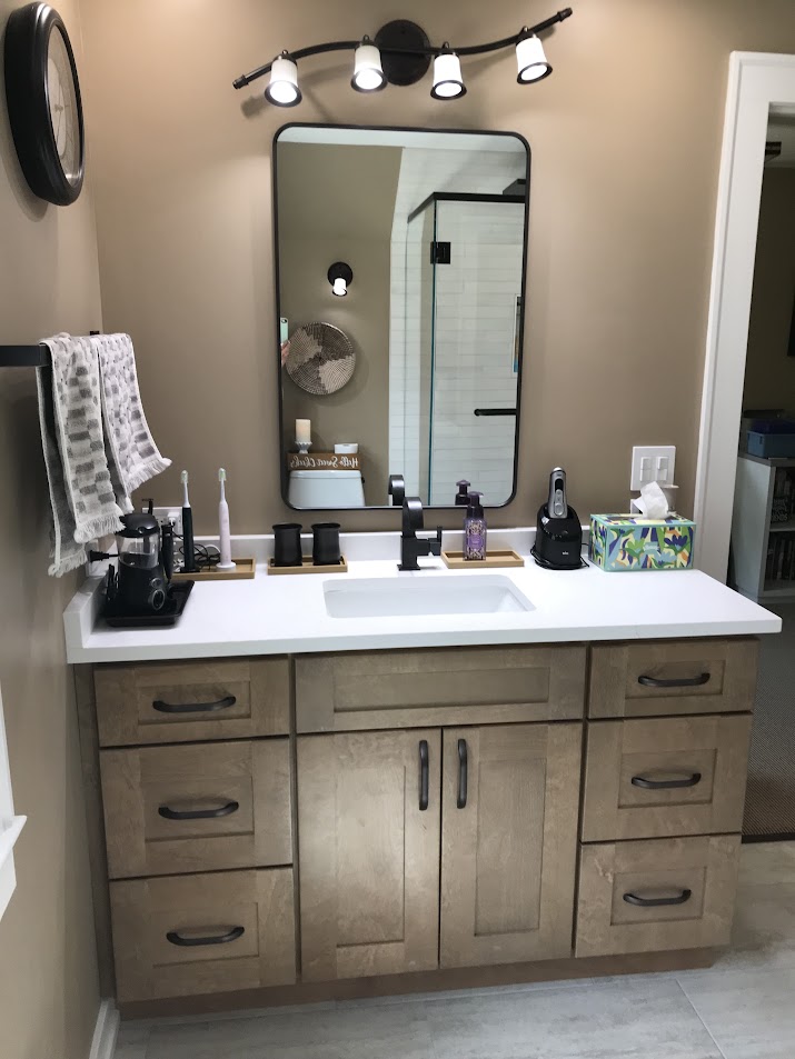 Style and function come together seamlessly in this bathroom transformation. Wood-grain cabinetry delivers extensive storage through well-designed drawers and cabinet doors. Crisp white countertops highlight the warm wood tones, while black hardware and fixtures create modern contrast.