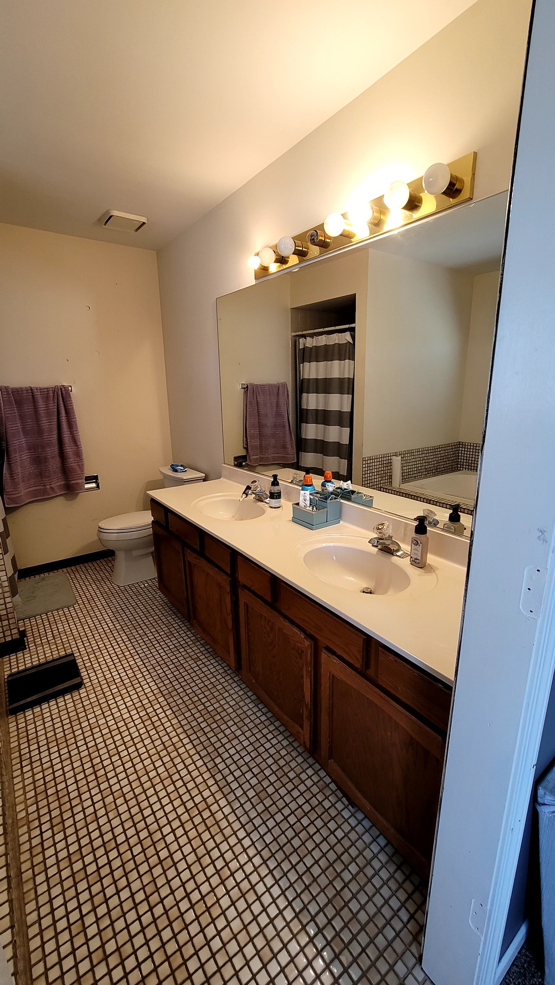 The double vanity features rich dark cabinetry with ample storage space and crisp white countertops for beautiful contrast. Black-framed mirrors and modern lighting fixtures add sophisticated finishing touches. The design flows seamlessly from shower to vanity, creating a harmonious space that feels both luxurious and serene.