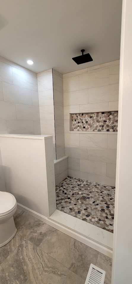 Clean lines and timeless elegance define this stunning Inverness Hoffman Estates bathroom transformation by CabinetLand. Large-format tiles create seamless walls while pebble mosaic accents add natural texture and visual interest. Dark cabinetry contrasts beautifully against white countertops, and sleek black fixtures provide striking modern touches throughout this serene, spa-like space.