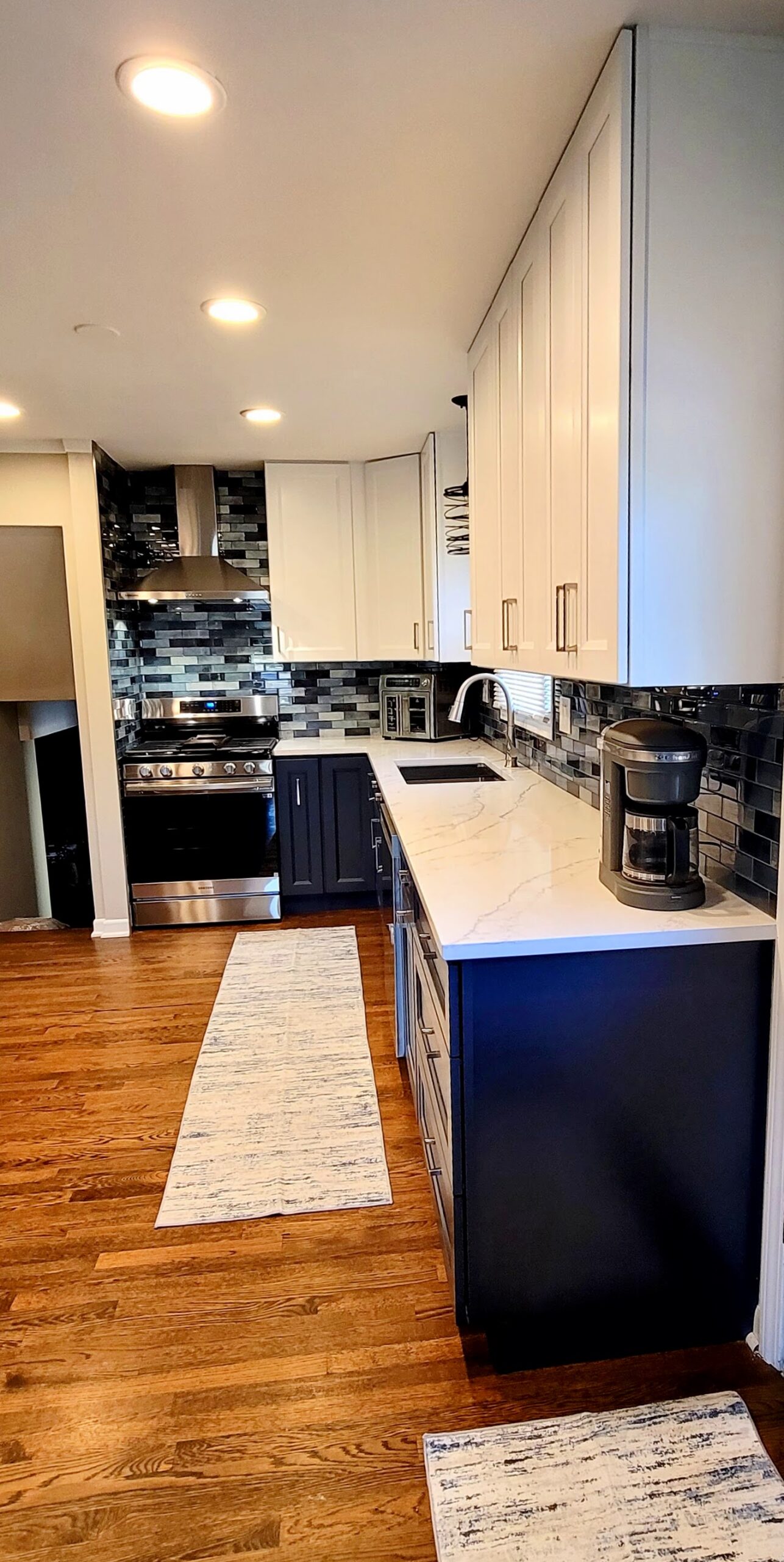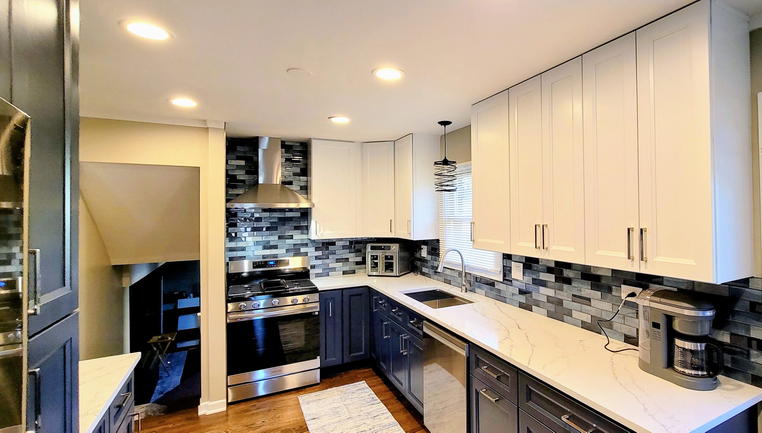 A multi-toned subway tile backsplash in shades of gray, black, and white connects both cabinet colors seamlessly, adding texture and depth. White quartz countertops provide clean, durable work surfaces ideal for meal preparation and entertaining. Recessed lighting keeps them bright and efficient.