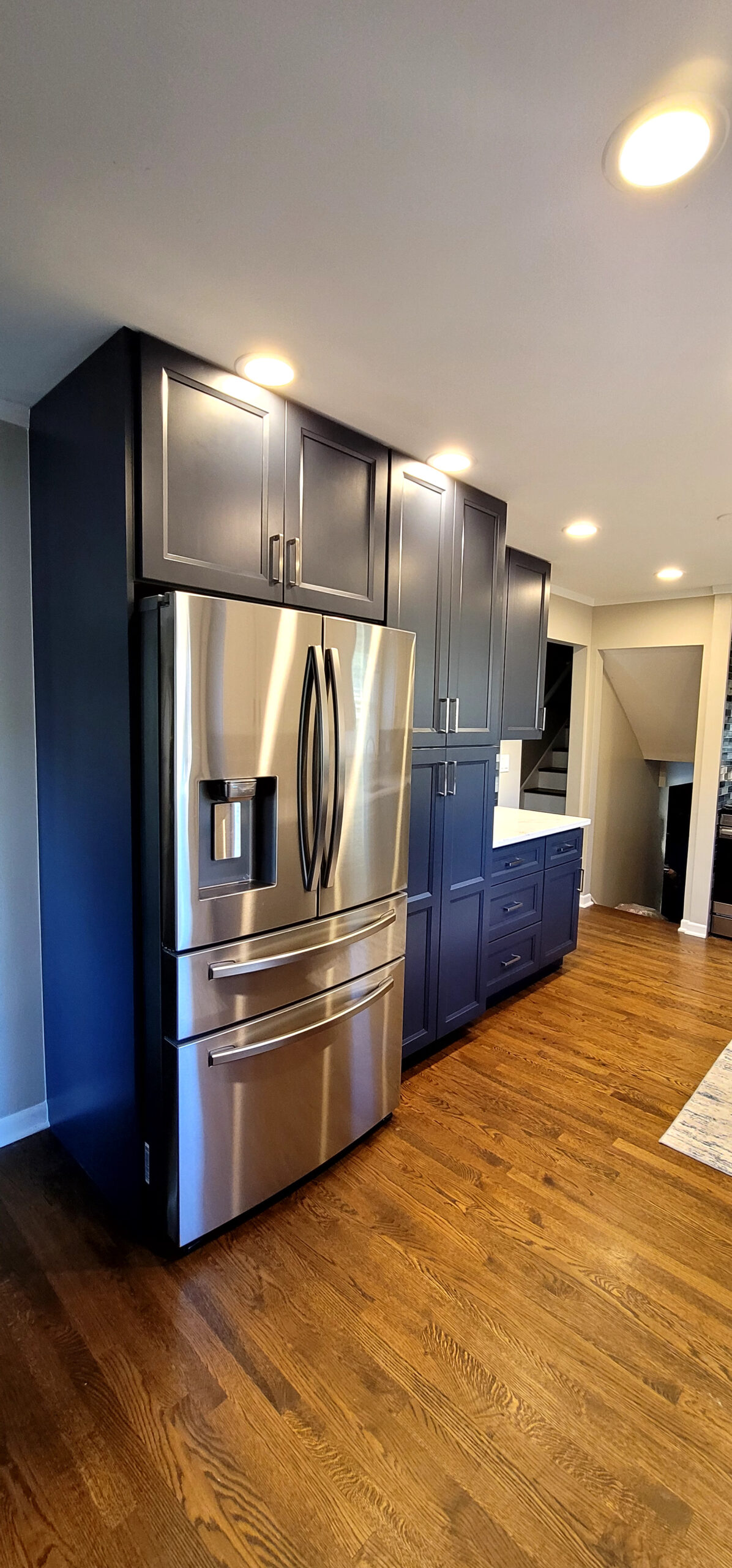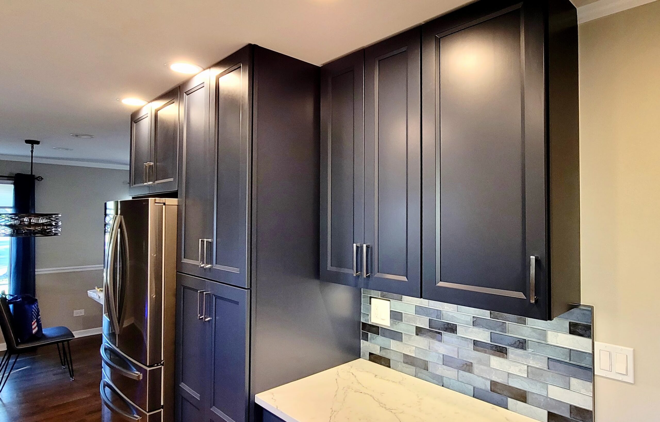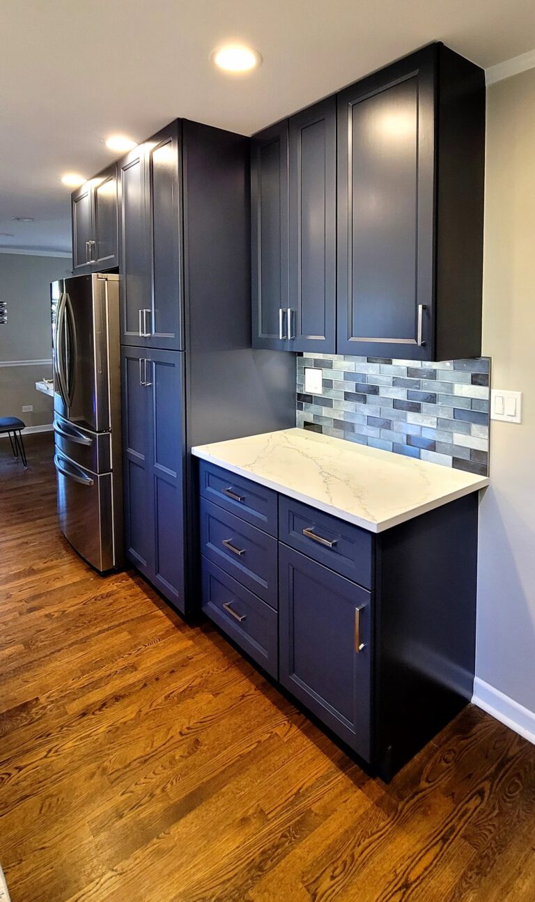 A new look was given to this Addison home’s kitchen. CabinetLand transformed this space into a showstopper with bold two-tone cabinetry. The crisp white uppers give the room an open, airy feel, while the deep navy blue lowers offer depth and sophistication. The gray subway tile backsplash brings the whole thing together perfectly. White quartz countertops, stainless steel appliances, and sleek hardware complete the space.