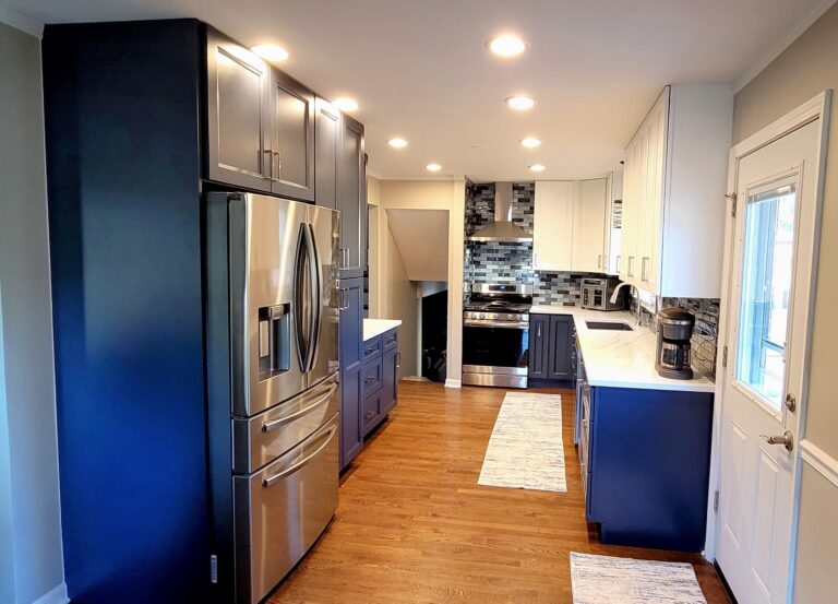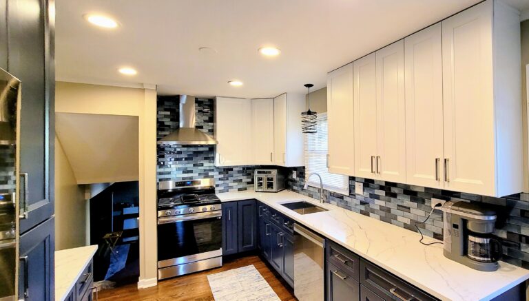 The main focus of the kitchen remodel was a dramatic two-tone cabinet design. The bright white shaker cabinets on the upper walls make the room feel open and breezy, and the deep navy blue lowers offer class and stability. This contrast makes the room look interesting without being too much.
